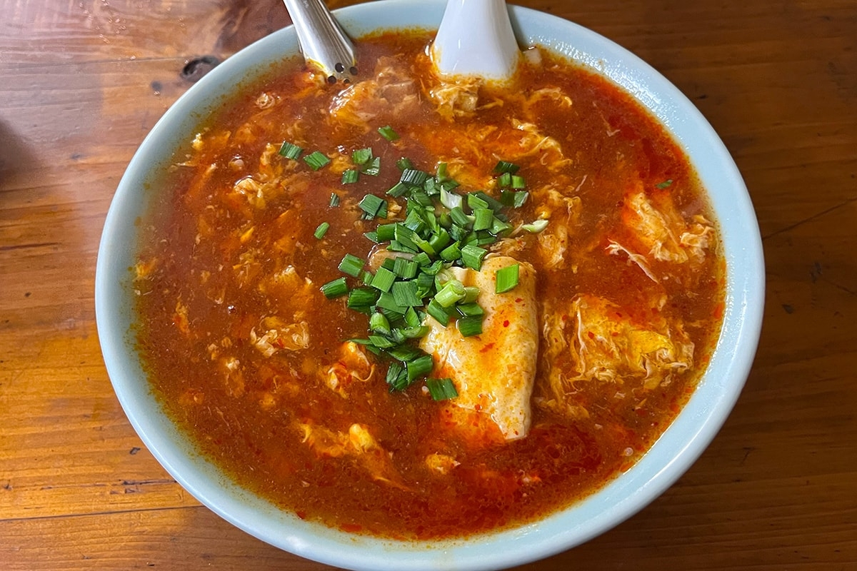 神宮前2丁目、ローカルにも愛されるお店「時田屋」。名物は、ここでしか味わえないと言っても過言ではない、溶き卵ミックスの辛いあんかけがたっぷりかかったラーメン「から玉」。やみつきになる旨辛ラーメンは並んでも食べたい逸品!※売り切れの場合もあります
