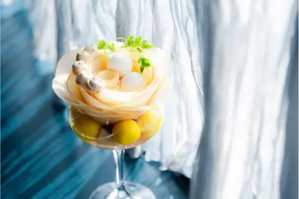食べ進めると現れる、檸檬のムースボールやミント香るシードルのジュレで、後味は爽やかに。