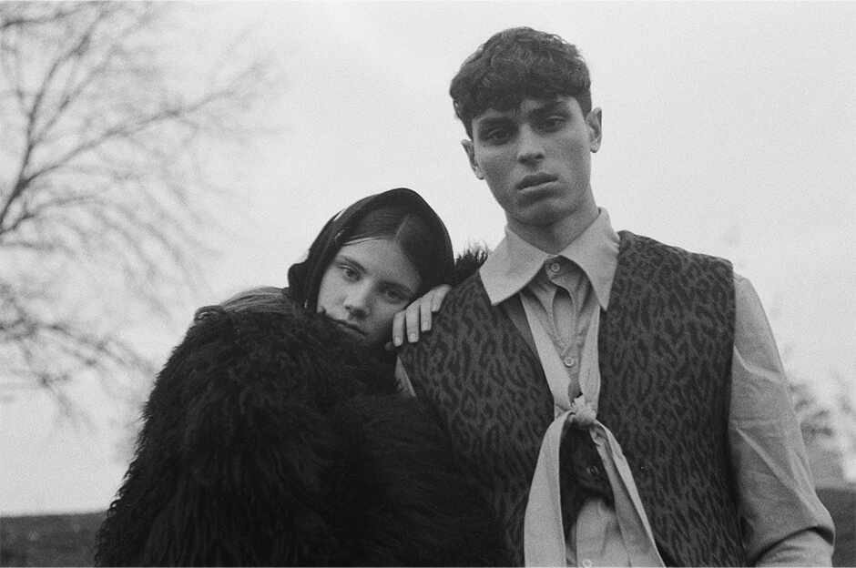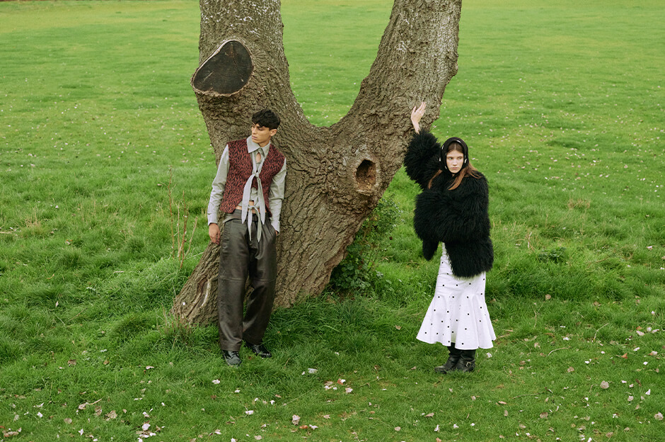 left - vest and shirt by STRONGTHE, trousers and shoes stylist’s ownright - jacket by BELINDA GARDINER, skirt and scarf by HAI, boots stylist’s own
