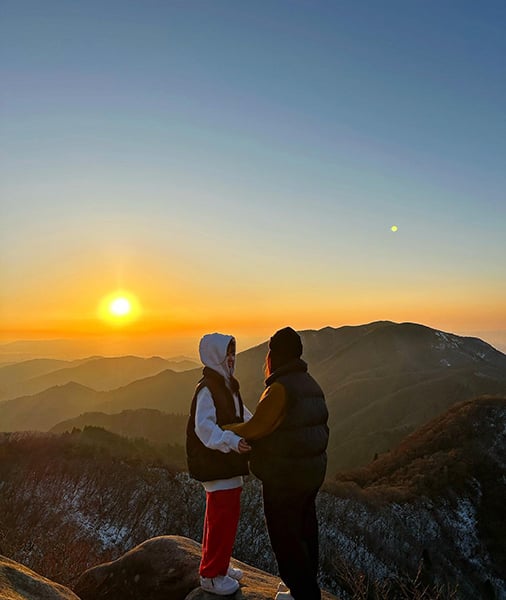 頂上に着いたら、岩場でダイナミックな1枚を。