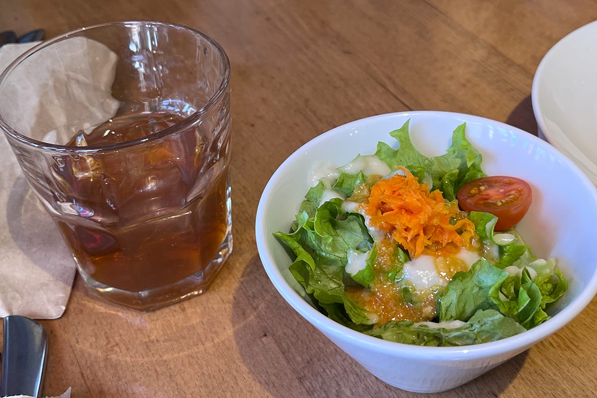 ランチタイム中は好きなピザを選ぶとピーチティー(おかわり自由)とサラダが付いてきてお得。それぞれ好きなピザを選んでシェアすることにした。