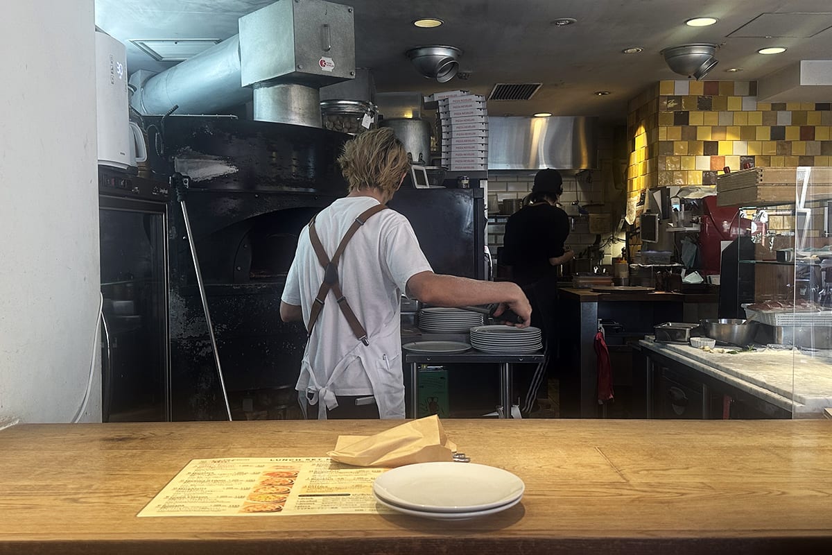頭の中のいくつかあるピザリストの中から外せない名店がケベロス。通りに面したテラスは海外のような雰囲気でインバウンドの方も多く、テーブルにはチェックの赤いクロス敷かれヴィジュアルも完璧なのだ。