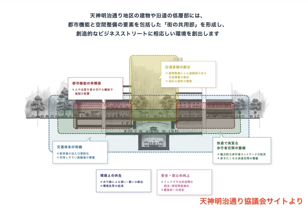 都市開発はそれぞれの開発事業者が独自でハードを作ると、外観デザインを優先した気を衒ったようなビルばかりが生まれ、街として調和が置き去りにされかねない。そのため、天神ビッグバンでは事業者同士が足並みを揃え、統一した街づくりを目指している。また、天神明治通りの地権者で作る協議会は街づくりのグランドデザインを取りまとめた。「アジアで最も創造的なビジネス街」という将来像に向け機能更新を進めていくもので、構想には地権者間および行政、We Love天神協議会等との調整?連携、街づくりに関する調査?研究、公的施設の整備?管理計画の作成などがもり込まれている。