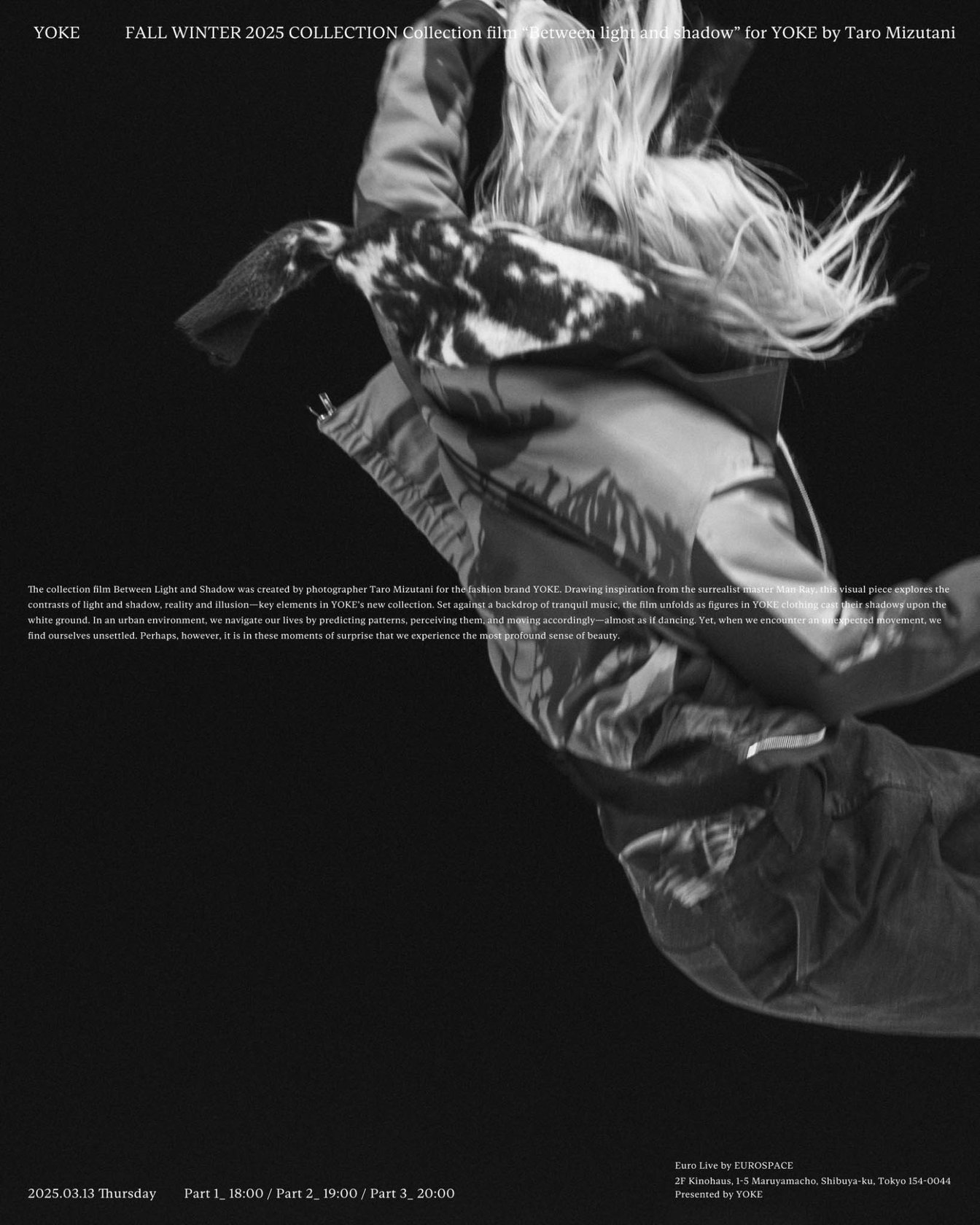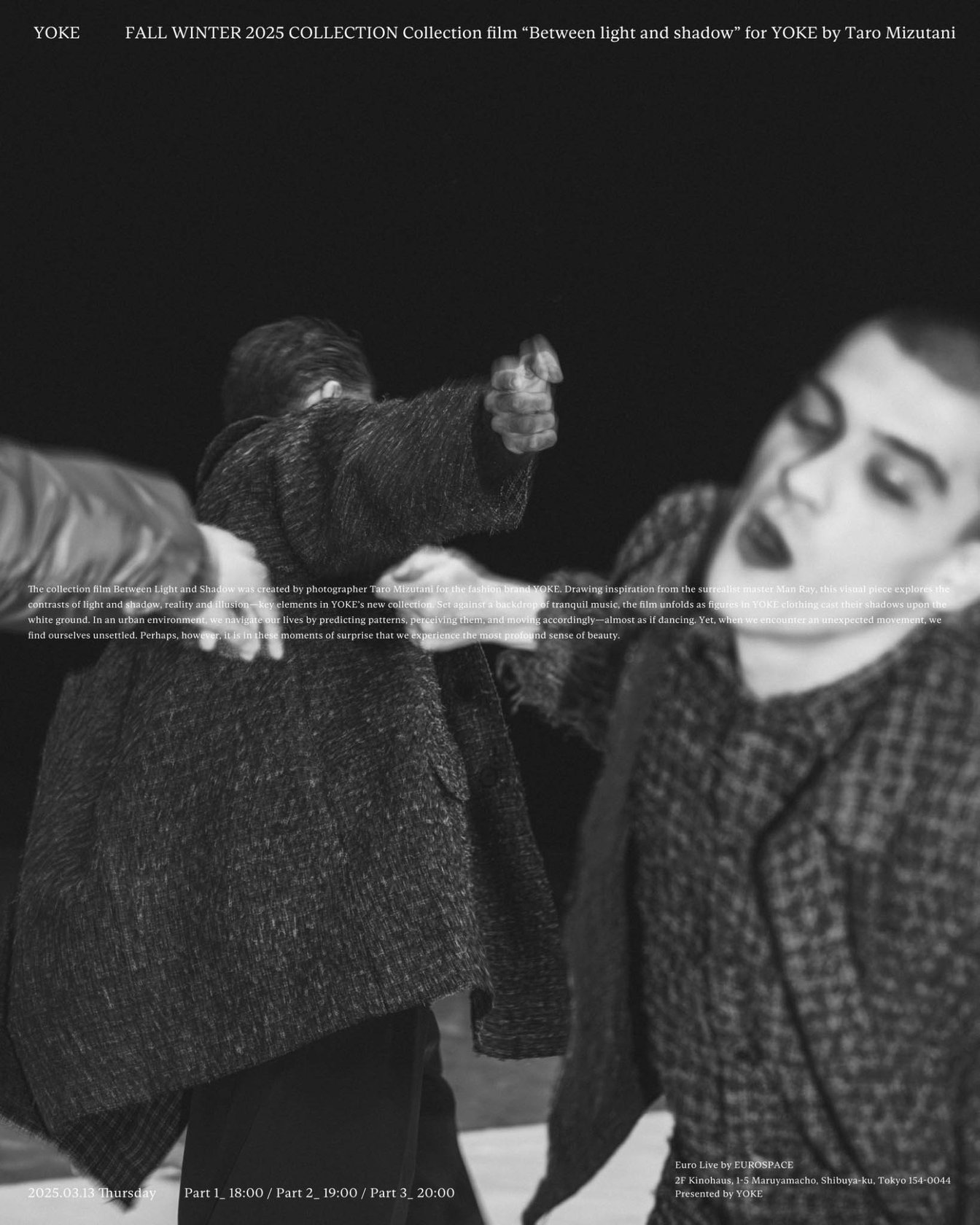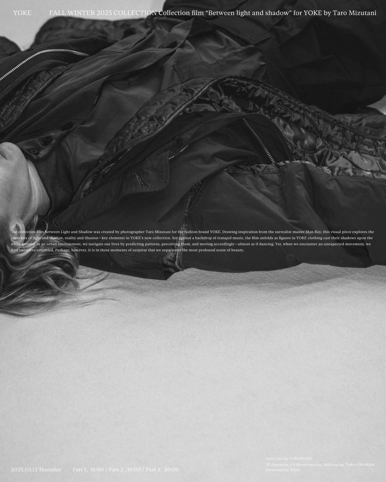 「ヨーク(YOKE)」が、2025年秋冬のコレクションフィルム「Between Light and Shadow」を渋谷ユーロライブで上映した。
