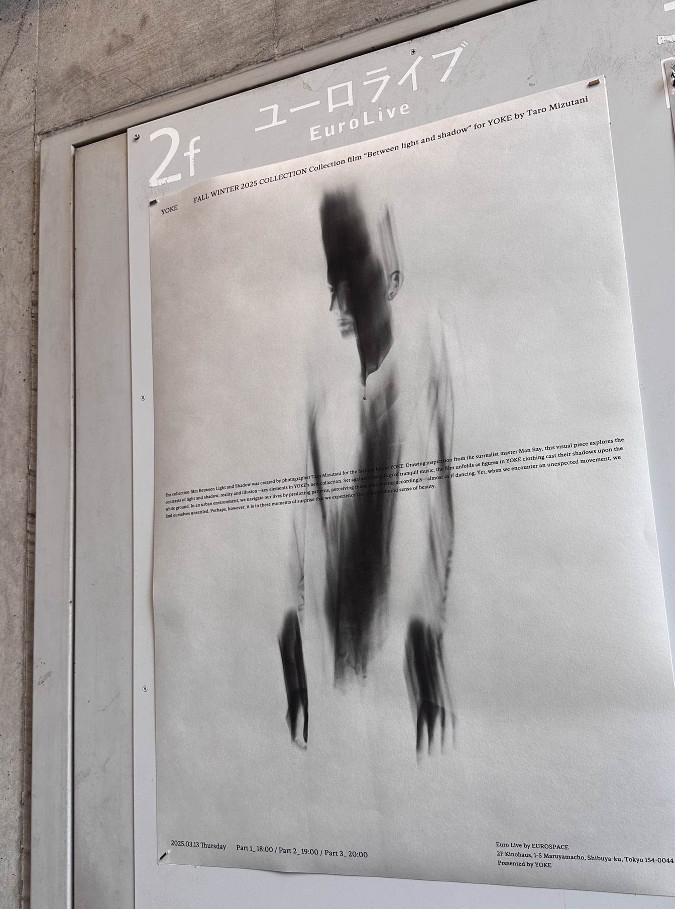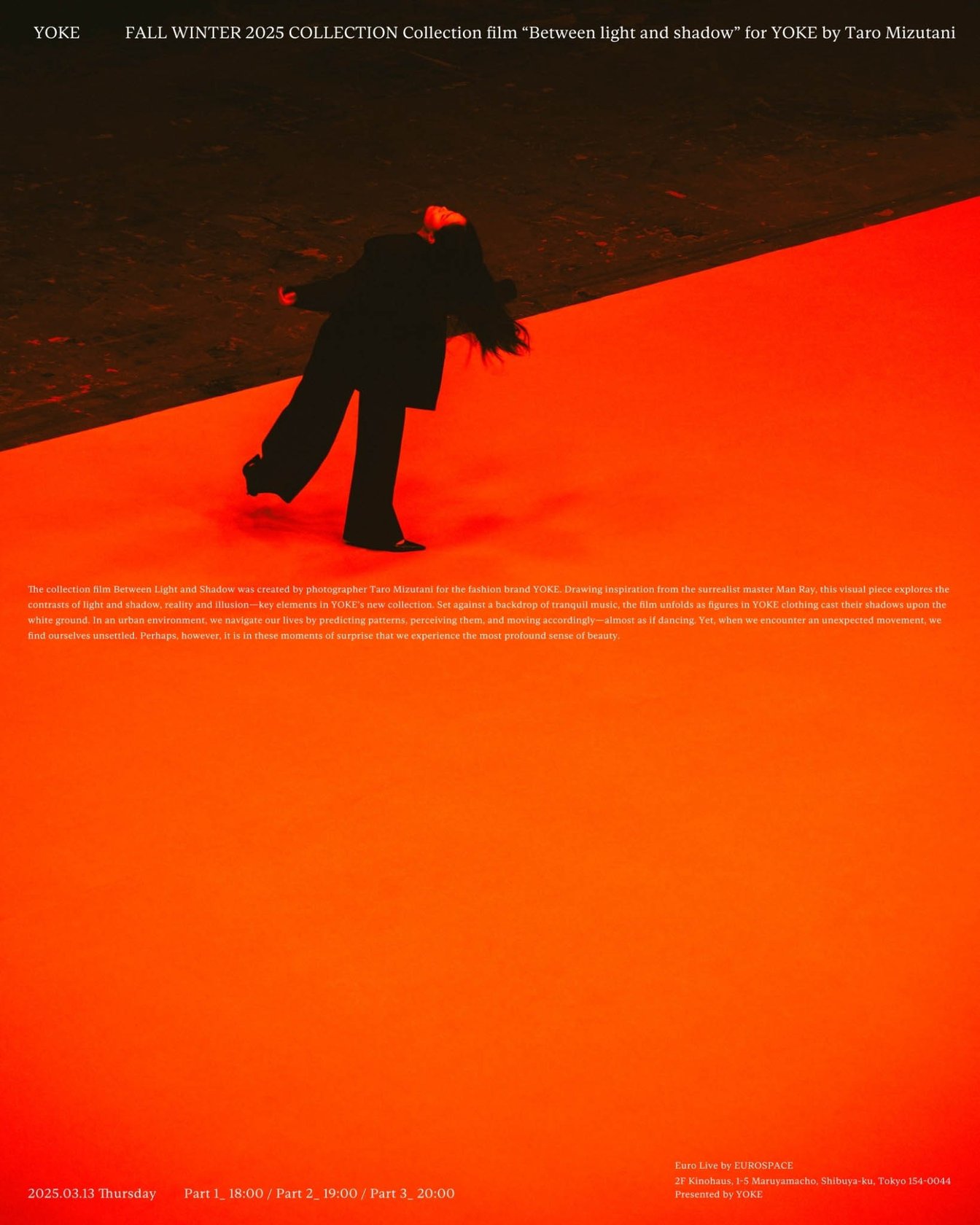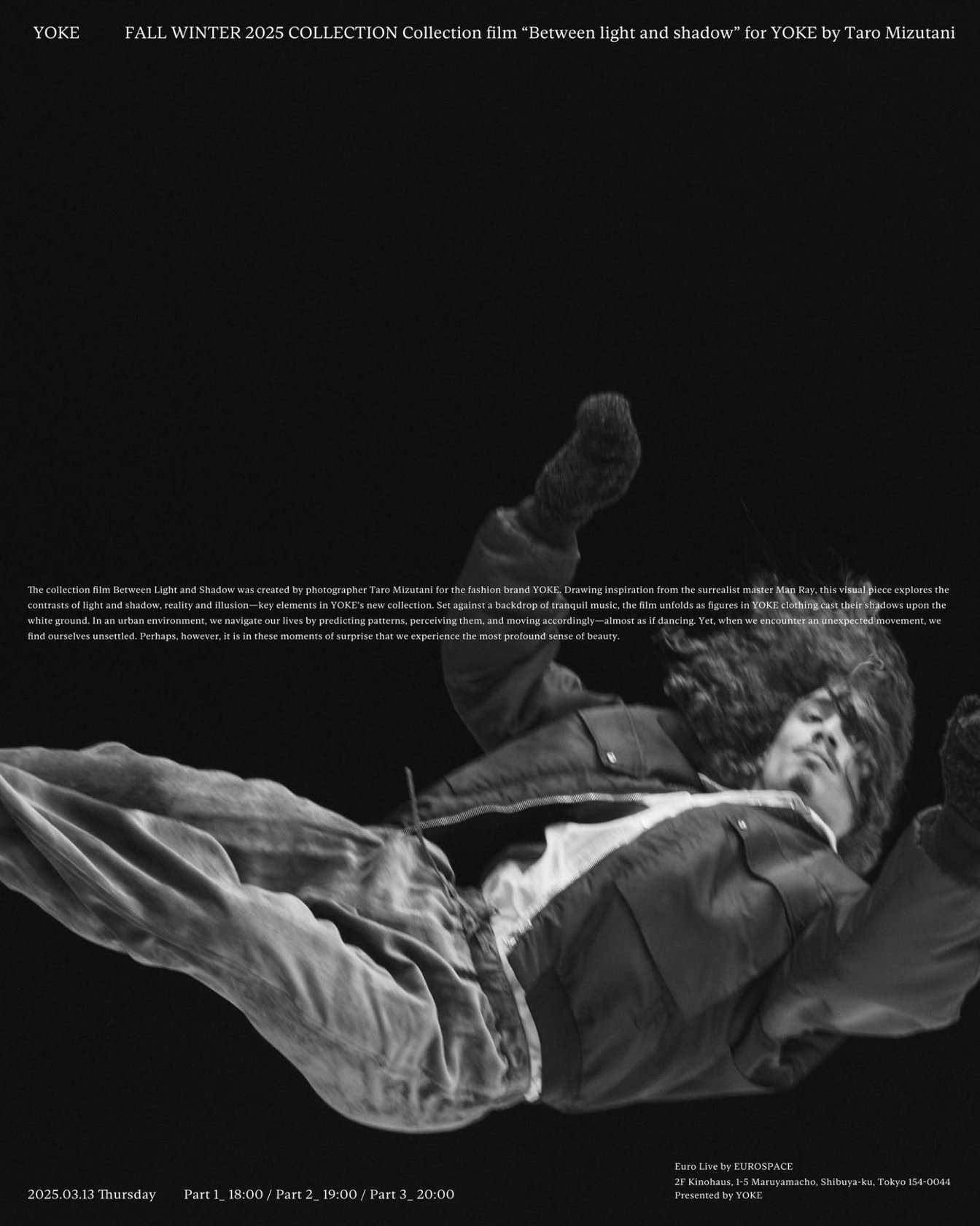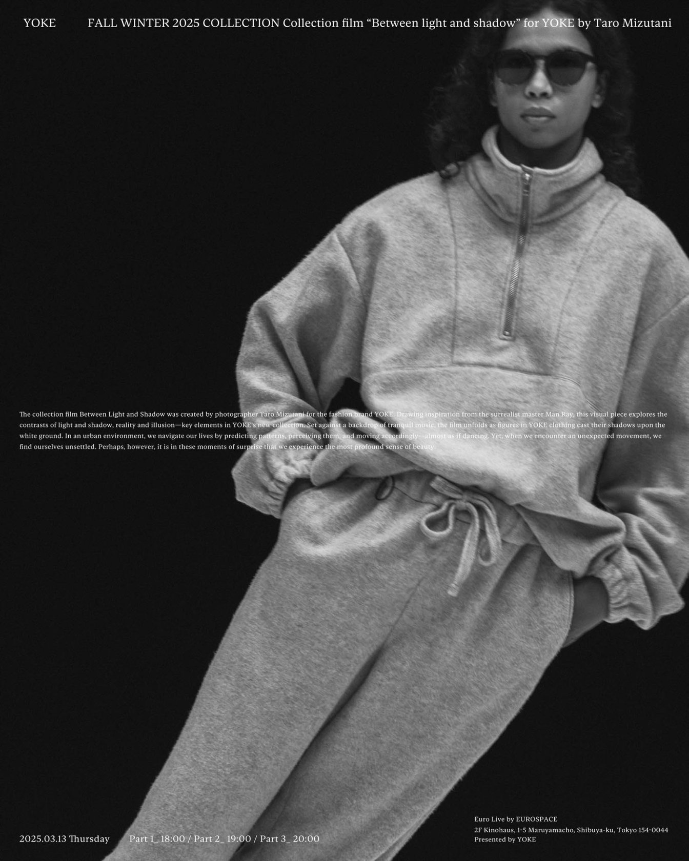 「ヨーク(YOKE)」が、2025年秋冬のコレクションフィルム「Between Light and Shadow」を渋谷ユーロライブで上映した。