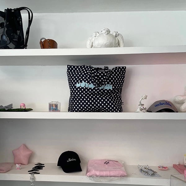 おしゃれさんの間で人気となっているのが、画面真ん中のトートバッグ「PURO STAR BAG」(6万6000ウォン)。星のドット柄がプリントされていて、水色の“SHALOM”の文字がかわいいんです。