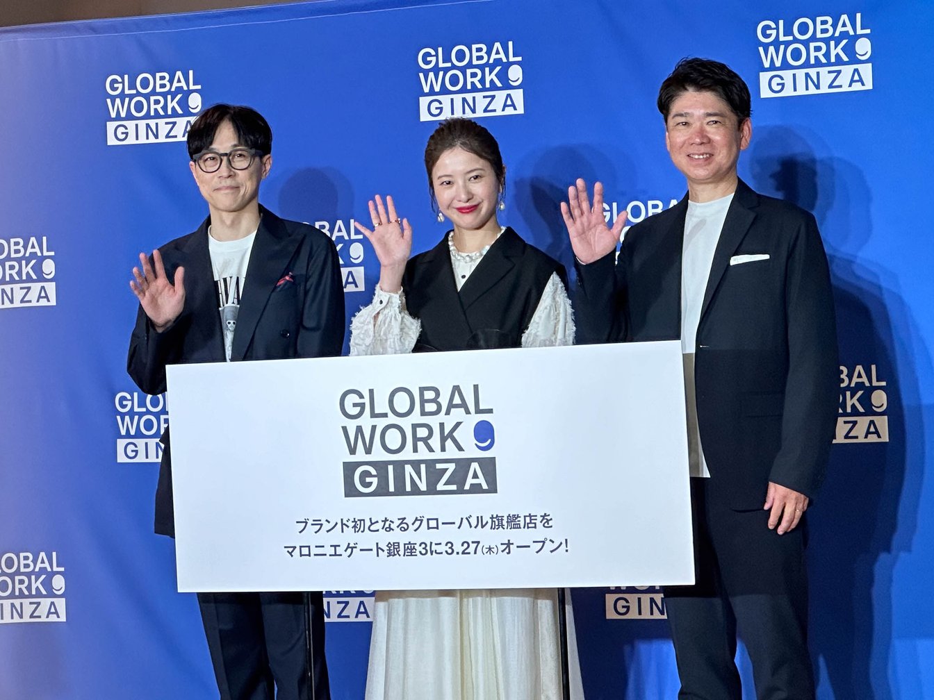 左から、銀座店 松山弘太郎店長、吉高由里子、アダストリア グローバルワーク 太田訓営業本部長