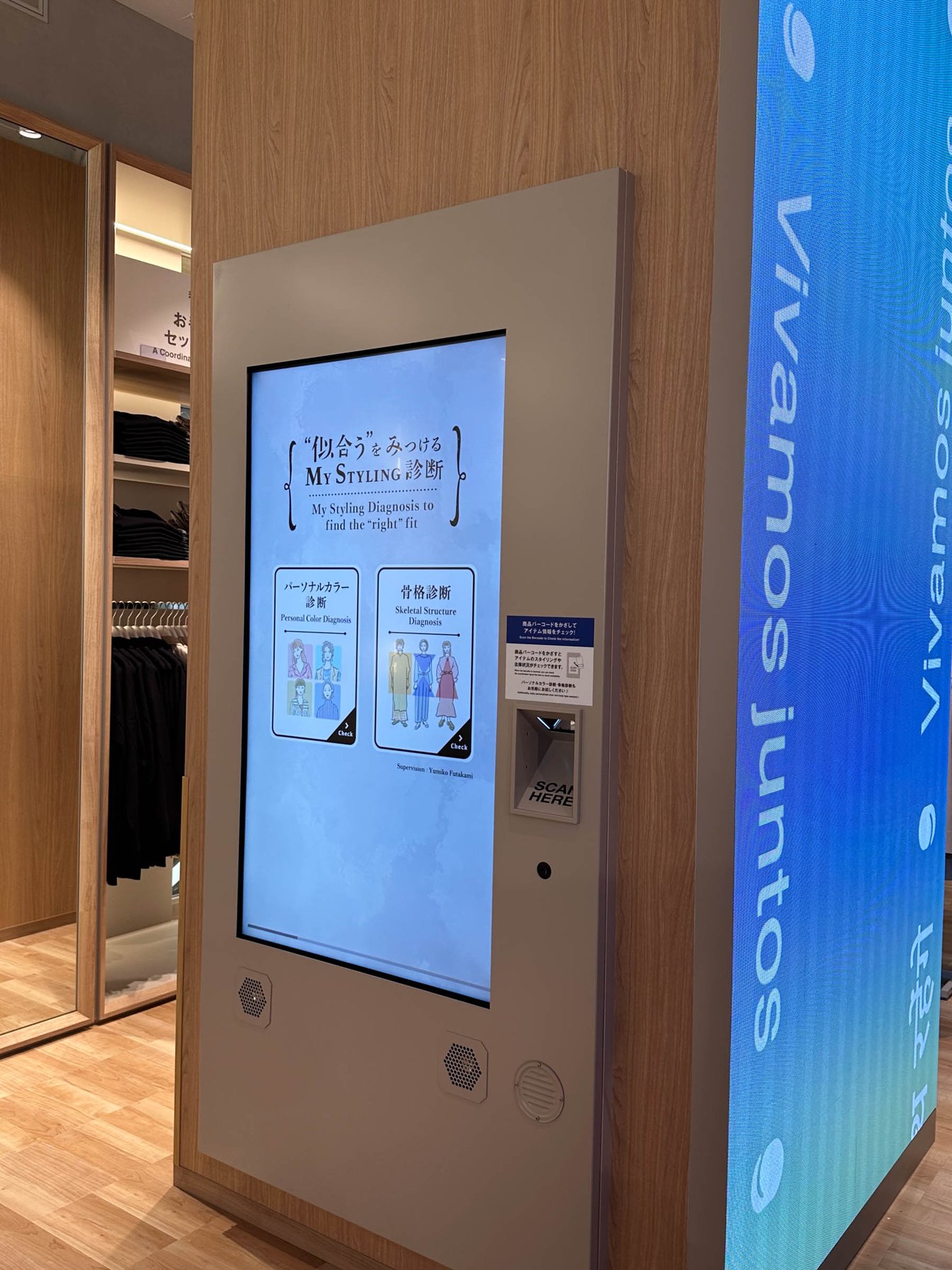 店頭では、骨格診断?パーソナルカラー診断を体験でき、その結果に応じて商品をレコメンドするサイネージを設置。そのほか、フォトブースやTシャツの自販機といったエンターテイメント性を重視した仕掛けを揃える。