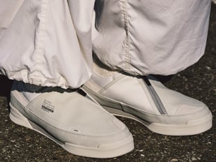 別注では、スクールサンダルをベースにしたタウンユース向けサンダル「バンドレイジー(BAND LAZY)」を採用。同モデルの特徴である面ファスナーで調整が可能なバンドや、クッション性に優れたソールなどを踏襲しつつ、アッパーはエムエイチエル.の定番カラーであるタンで仕上げた。オリジナルのメッシュのシューズバッグが付属し、価格は7700円。
