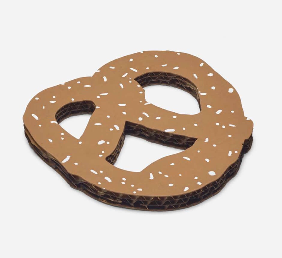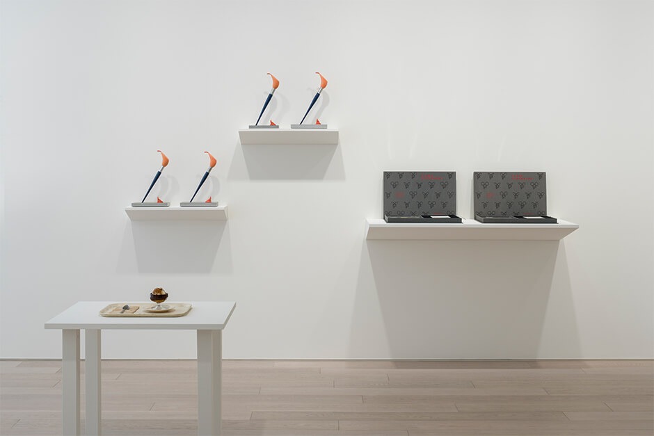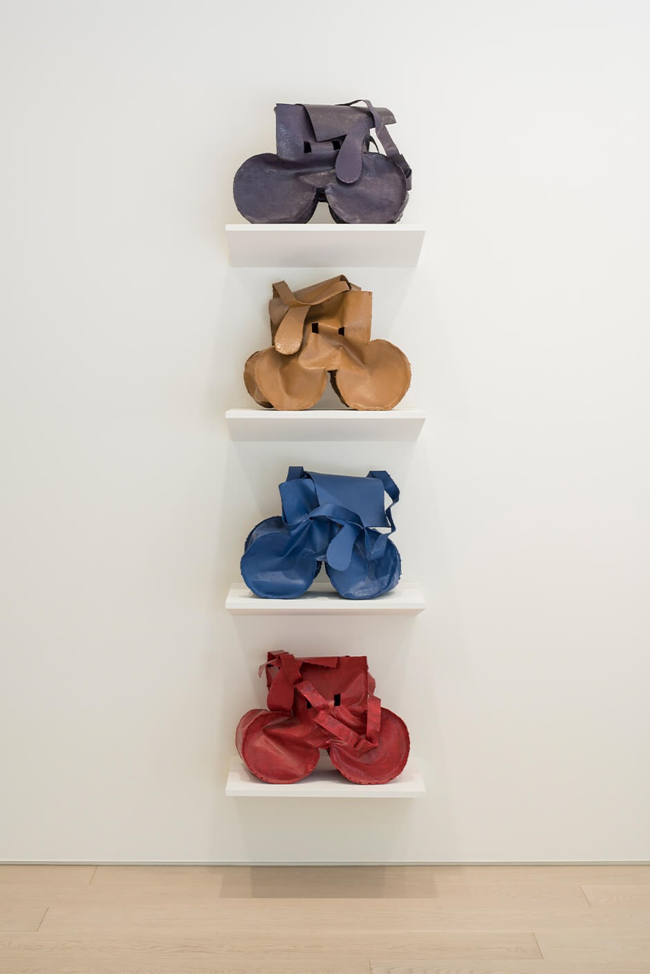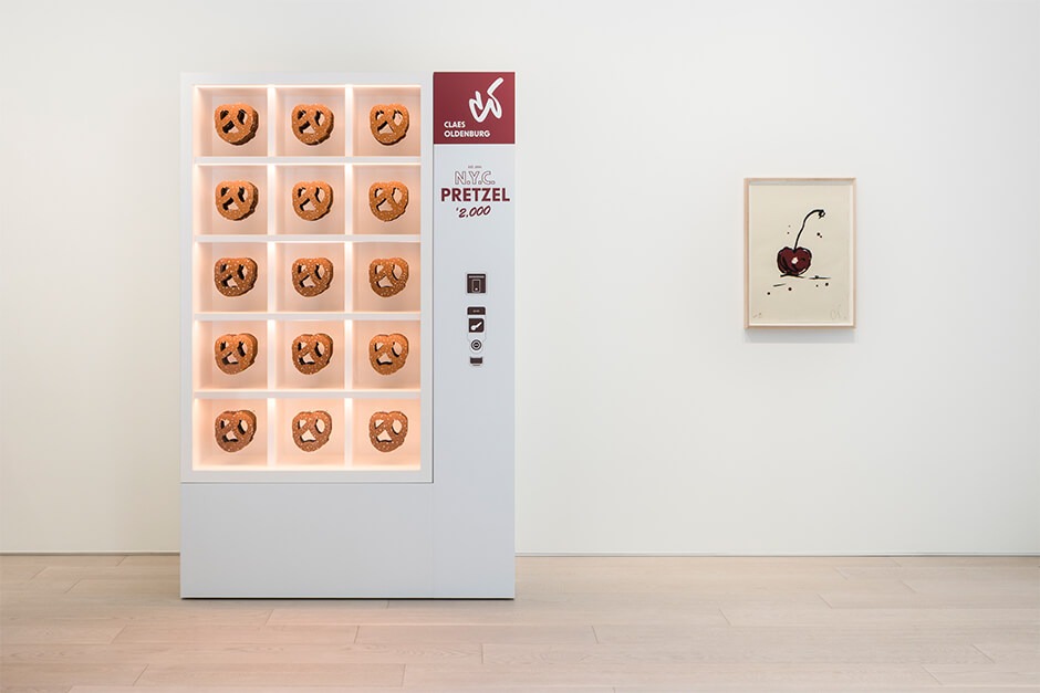 会場に並ぶのは、塗装した段ボールで制作した「N.Y.C. Pretzel」(1994)のマルチプル作品を約60点入れた?動販売機型のショーケースをはじめ、塗装されたアルミニウムと真鍮で制作されたシュークリーム「Profiterole」(1989?1990)、縫製されたキャンバス素材による「Mouse Bags」(2007?2017)など。