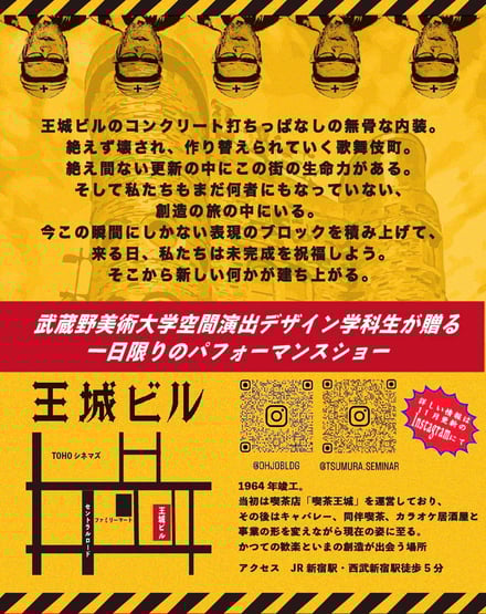 イベント名の「セメントモメント」は、無機質で強度のあるセメント(cement)と、今この瞬間に生まれる表現や感情を表すモメント(moment)を掛け合わせた造語。会場となる王城ビルは1964年竣工で、当初は喫茶店「喫茶王城」として運営されていた。その後はキャバレー、同伴喫茶、カラオケ居酒屋と事業の形を変えながら現在に至る。コンクリート打ちっぱなしの無骨な内装が特徴で、絶えず壊され作り替えられていく歌舞伎町の生命力を体現する場所として同展の会場に選ばれたという。