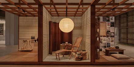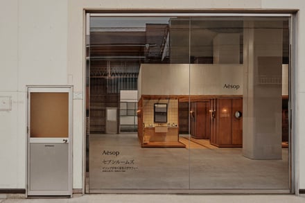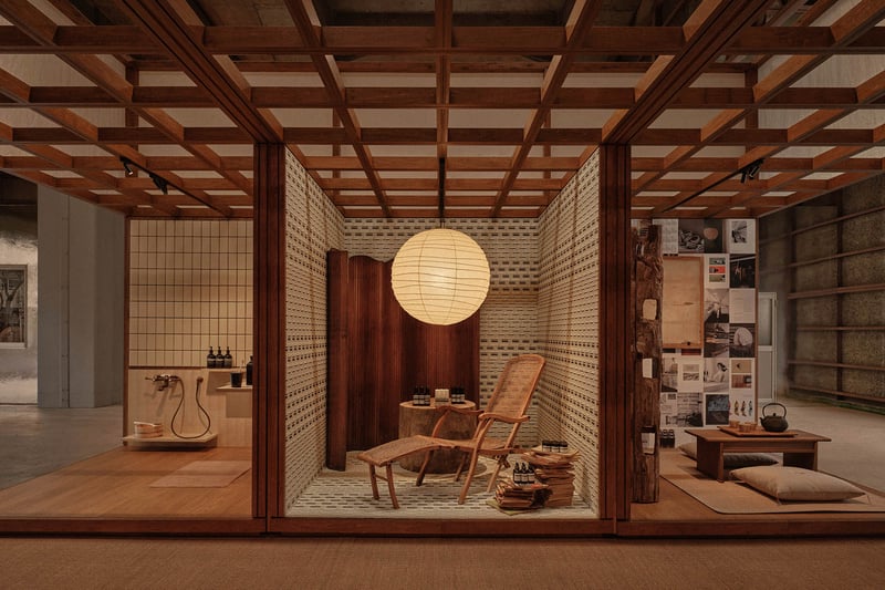 浴室はヘアケア、ボディケア、パーソナルケア商品を軸に構成し、入浴の美学を探求する姿勢を表現。日光浴室は陽射しを享受する空間とし、屏風を背景に彫刻家のイサム?ノグチが手掛けたペンダントランプを配した。台所や工房を想起させる空間にも、それぞれの物語性を感じさせるファニチャーやディスプレイを起用し、来場者を現在という時間軸に引き戻す構成とした。空間内に点在するイソップの商品は試用?購入でき、知性と感性を双方に訴えかける体験を提供する。