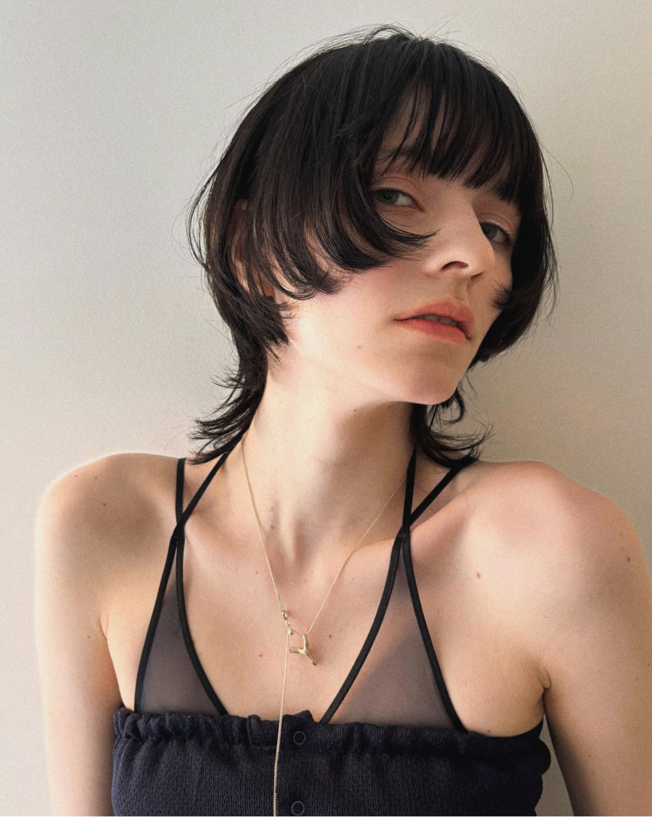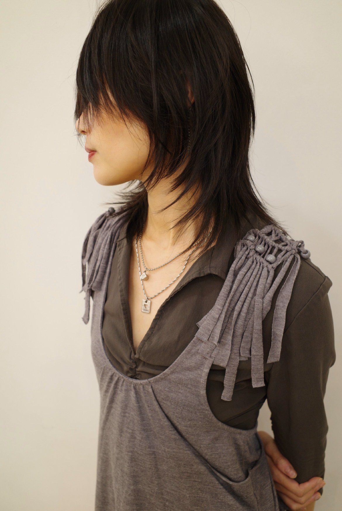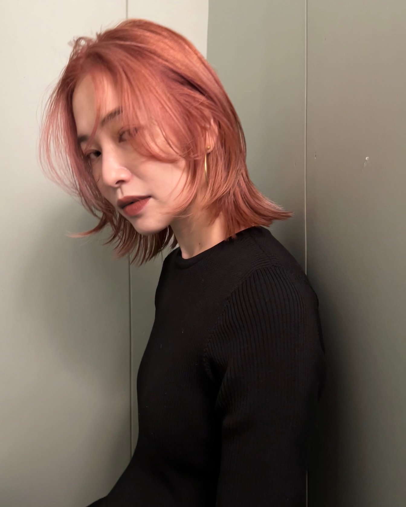 大胆なハイレイヤーのウルフミディ。スタイリング次第で表情が変わるデザインなので、ストリートにカジュアル、モードまで幅広いファッションにマッチします。ヌーディーな色やラメを使った個性的なメイクとの相性が抜群です。(@mitsuki_jurk)