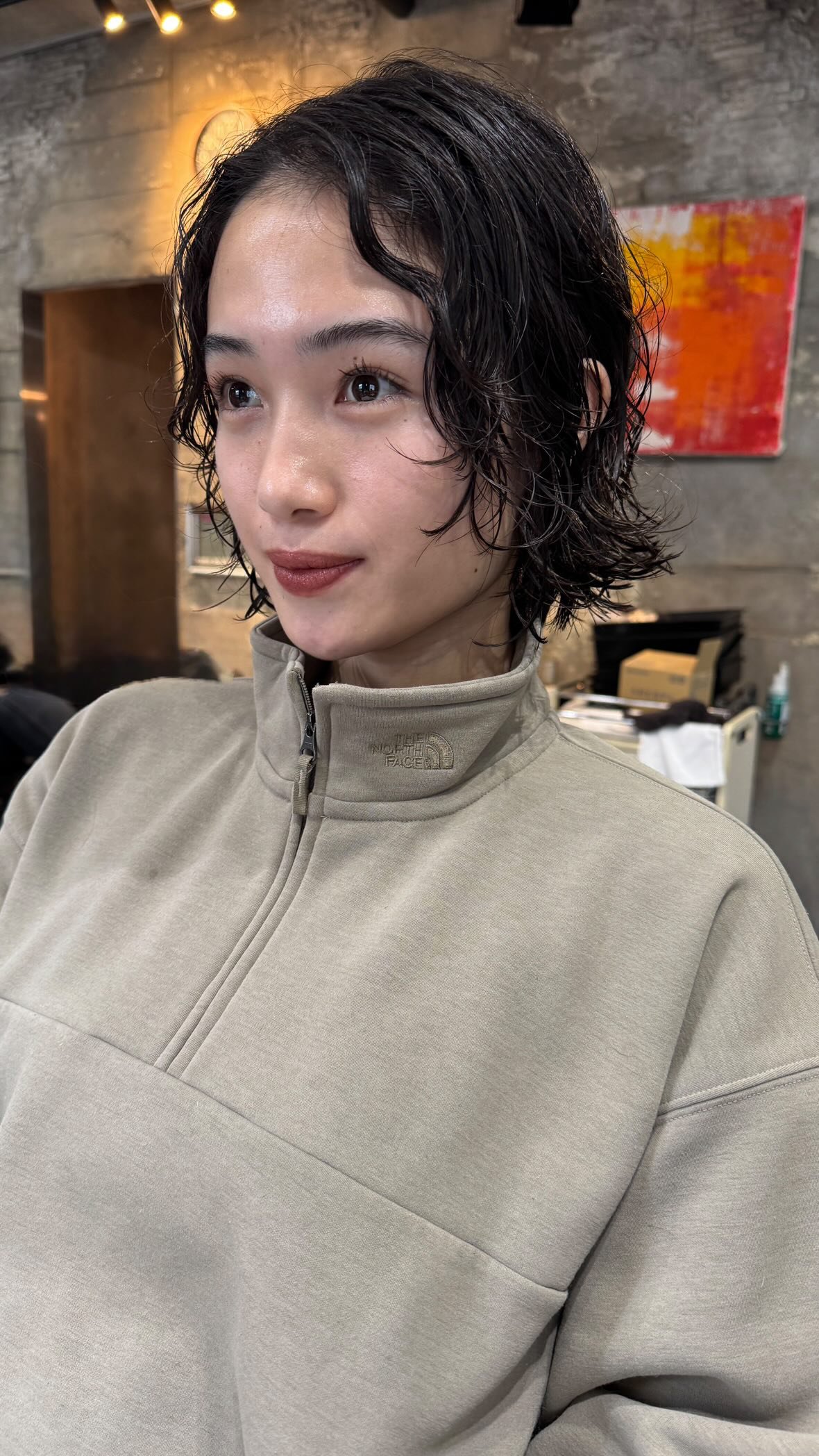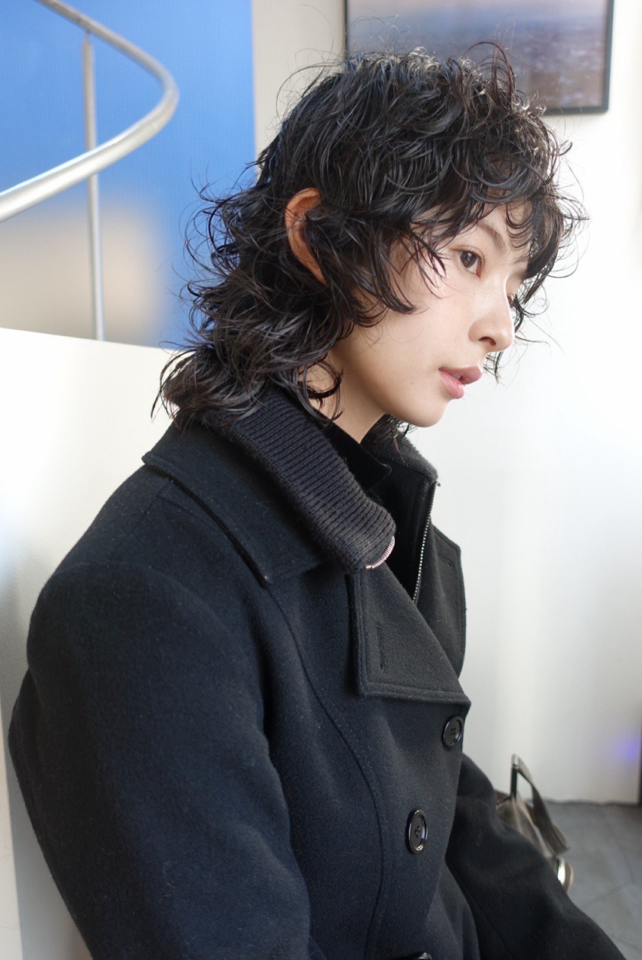ハードパーマをかけたミディアムレイヤースタイル。顔まわりを切り込んでいるので、バームで束感を出せばドライに、ワックスでウェットな仕上がりにすることもできます。ピンで髪を上げてガーリーなファッションに合わせたり、下ろしてしっかりカールを出せばモードなスタイルにも◎。(@fuu.une)