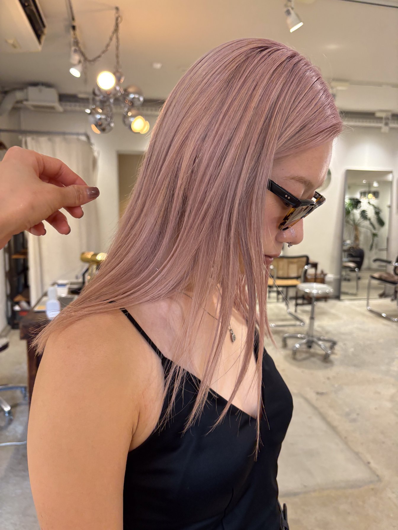 淡いピンクカラーにフォーカスした、引き算のストレートスタイル。ブリーチでしっかり色を抜いてベースを作ることがポイントで、黒髪からであればブリーチ2回を推奨します。ハイトーンはファッション好きな大人のお客さまから人気ですが、ピンクは意外と服の色を選ばないので初心者の人にもおすすめ。あえて洗練されたモードな洋服と合わせたり、メイクアップも跳ね上げアイラインなどを取り入れて、甘くまとめないのがおすすめ!(@mayukaabe)