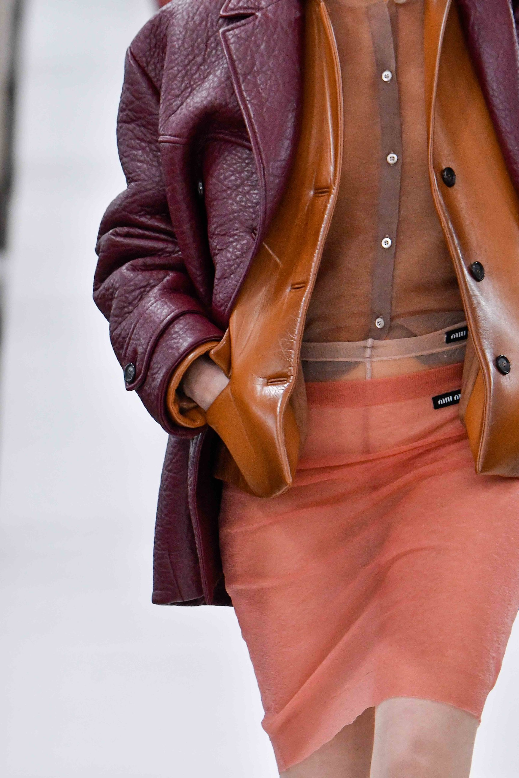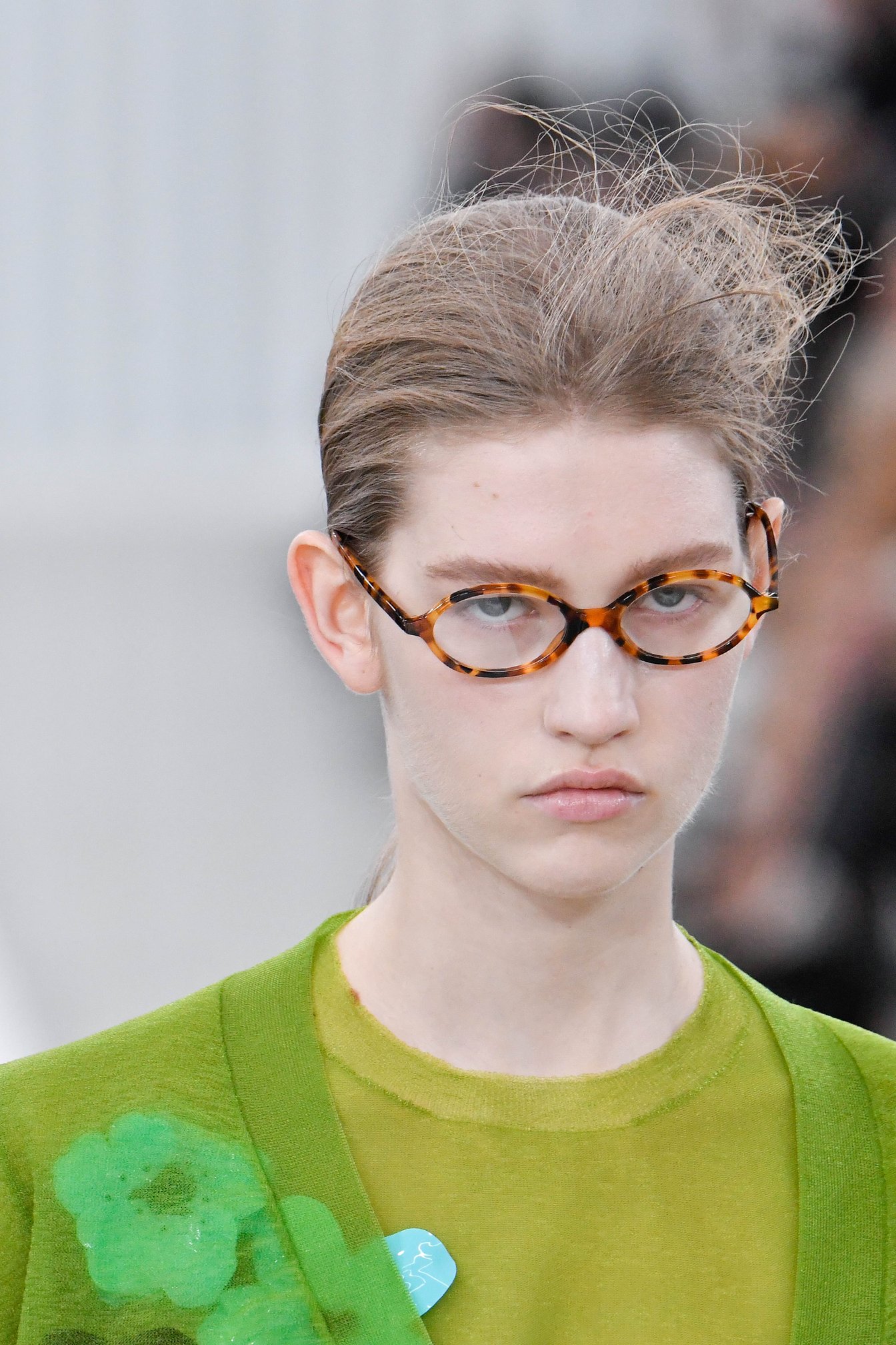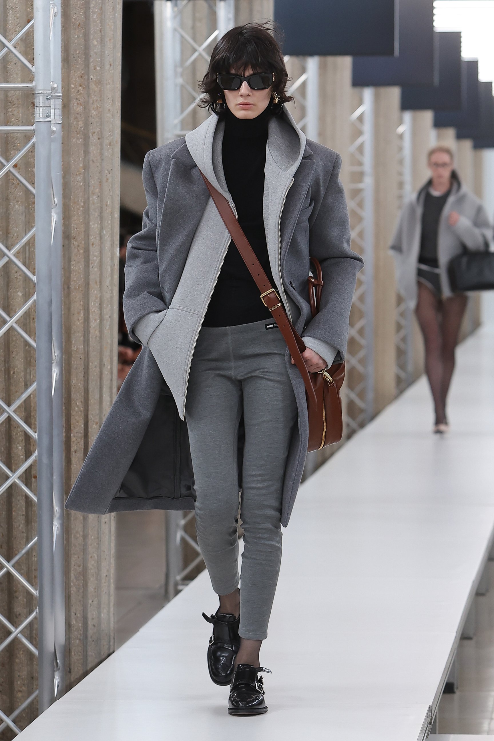 ツインニットやフード付きスウェットといった慣れ親しんだアイテムも、大胆な素材使いやシルエットで表情を変える。また、硬質な素材で作られたフラワーモチーフやビジューが繊細な生地にあしらわれ、効果的なコントラストを生み出していた。コレクションノートに「見るということは、思考の窓のようなもの」と記されていた通り、ディテールの一つひとつにミウッチャの哲学を感じさせるコレクションとなった。