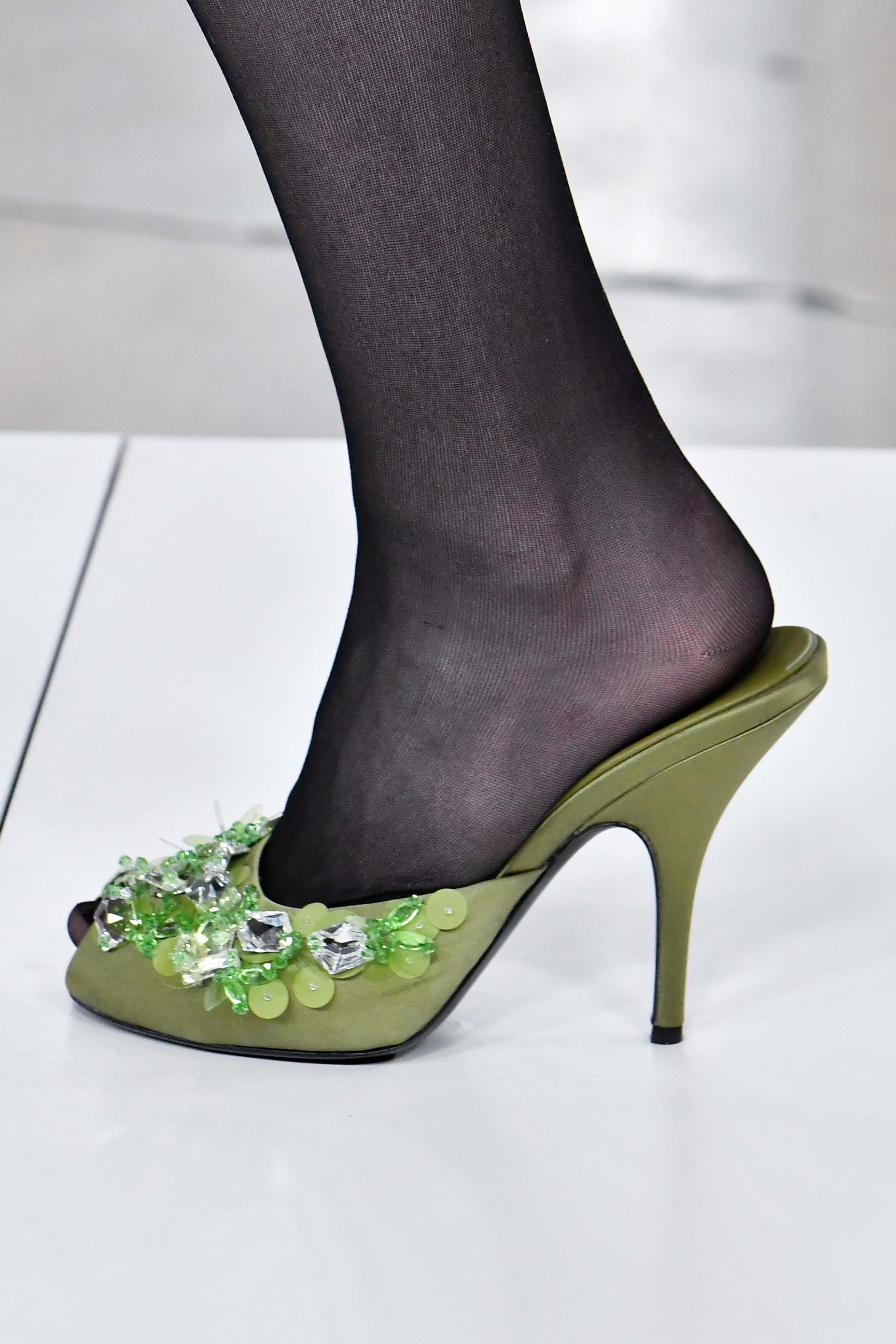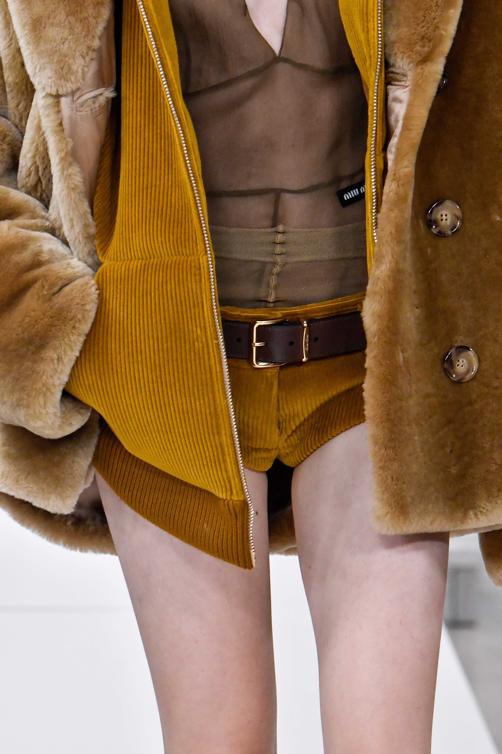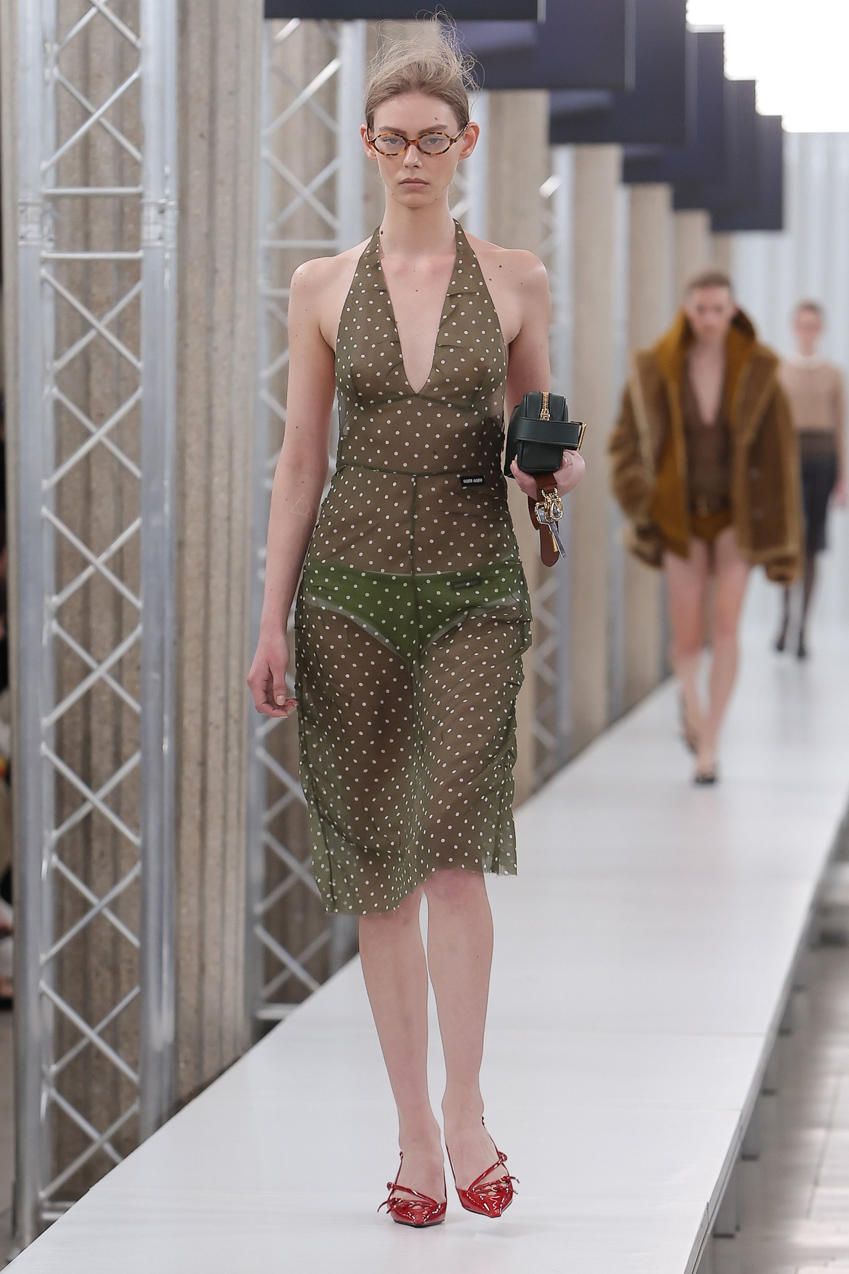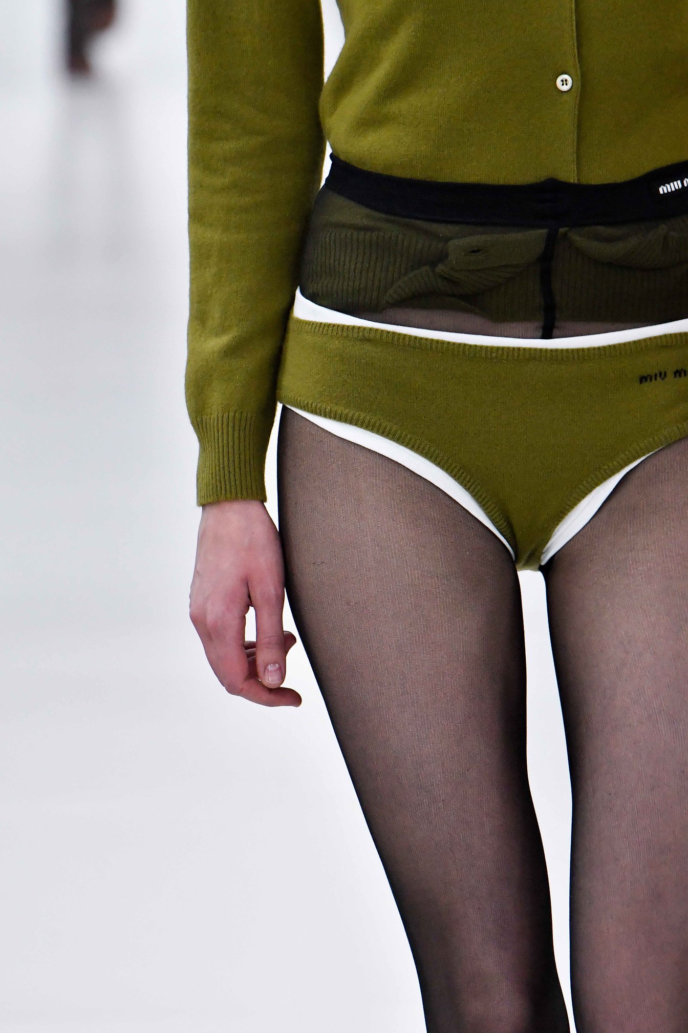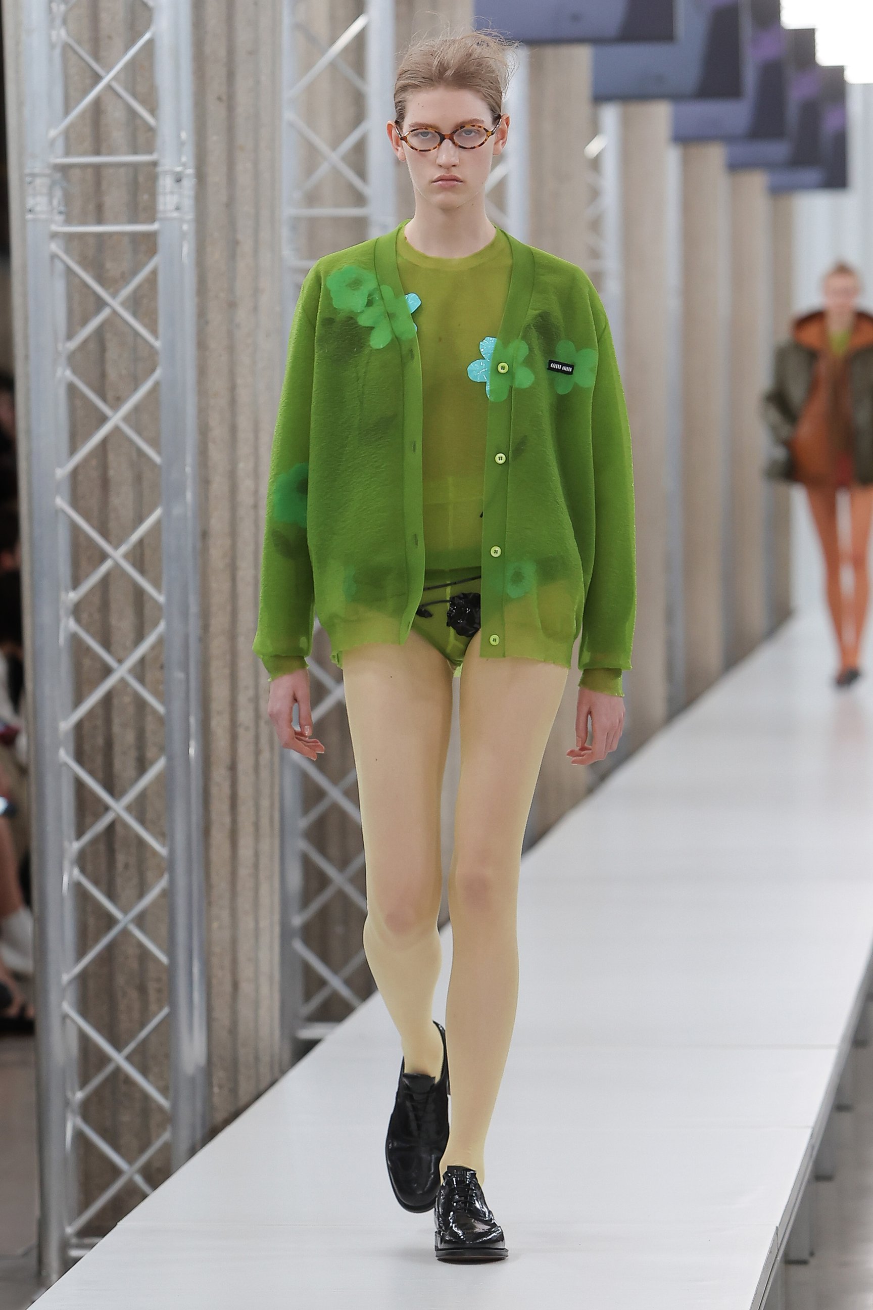そのほか、シアーなワンピースとアンダーウェアもレイヤードされ、下着に縫い付けられた「miu miu」のロゴが見え隠れする。ストッキングをウエストからはみ出させたブルマ風のショーツなども登場し、「インナーウェア」と「アウターウェア」のコンセプトを逆転させた、新たなスタイルを提案した。
