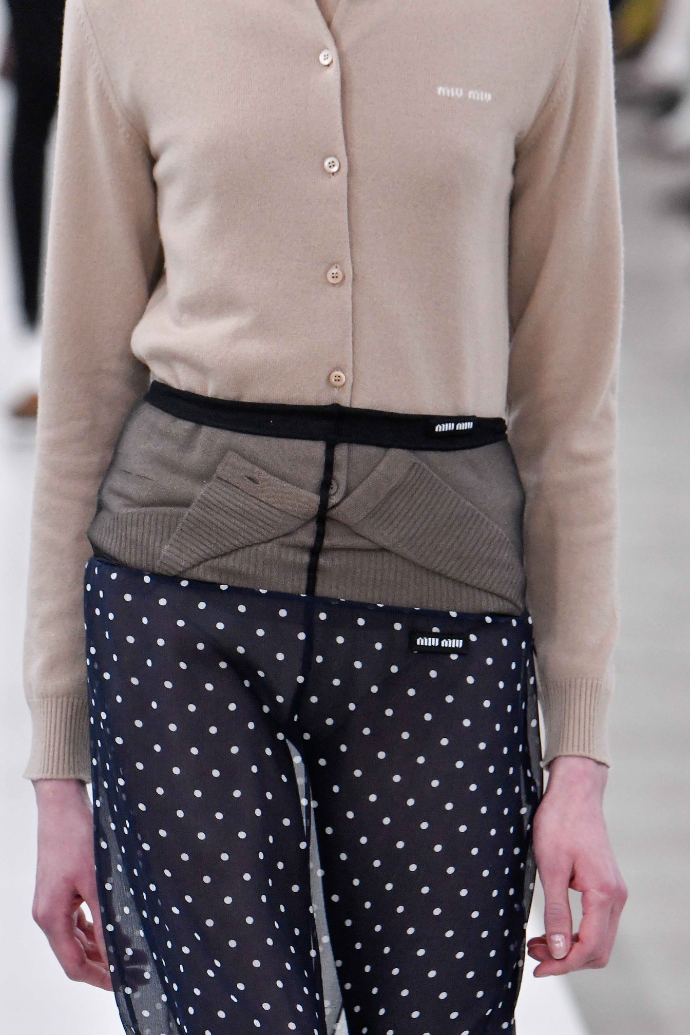 オープニングを飾ったのは映画「ニンフォマニアック」で知られる女優のミア?ゴス(Mia Goth)。グレーのカーディガンに水玉模様の膝丈スカートを合わせたスタイルだが、スカートはローライズで、ストッキングの履き口がウエストから覗く。ストッキングの中に託し込まれたカーディガンの裾や、スカートから透けるストッキングの縫い目のラインなど、本来”見えてはいけないもの”をあえて露出させていた。マイクロミニなどで"見せパン"するデザインは過去数シーズンにわたりミュウミュウが提案しているスタイルだが、今回はそのコンセプトをさらに進化させた形だ。