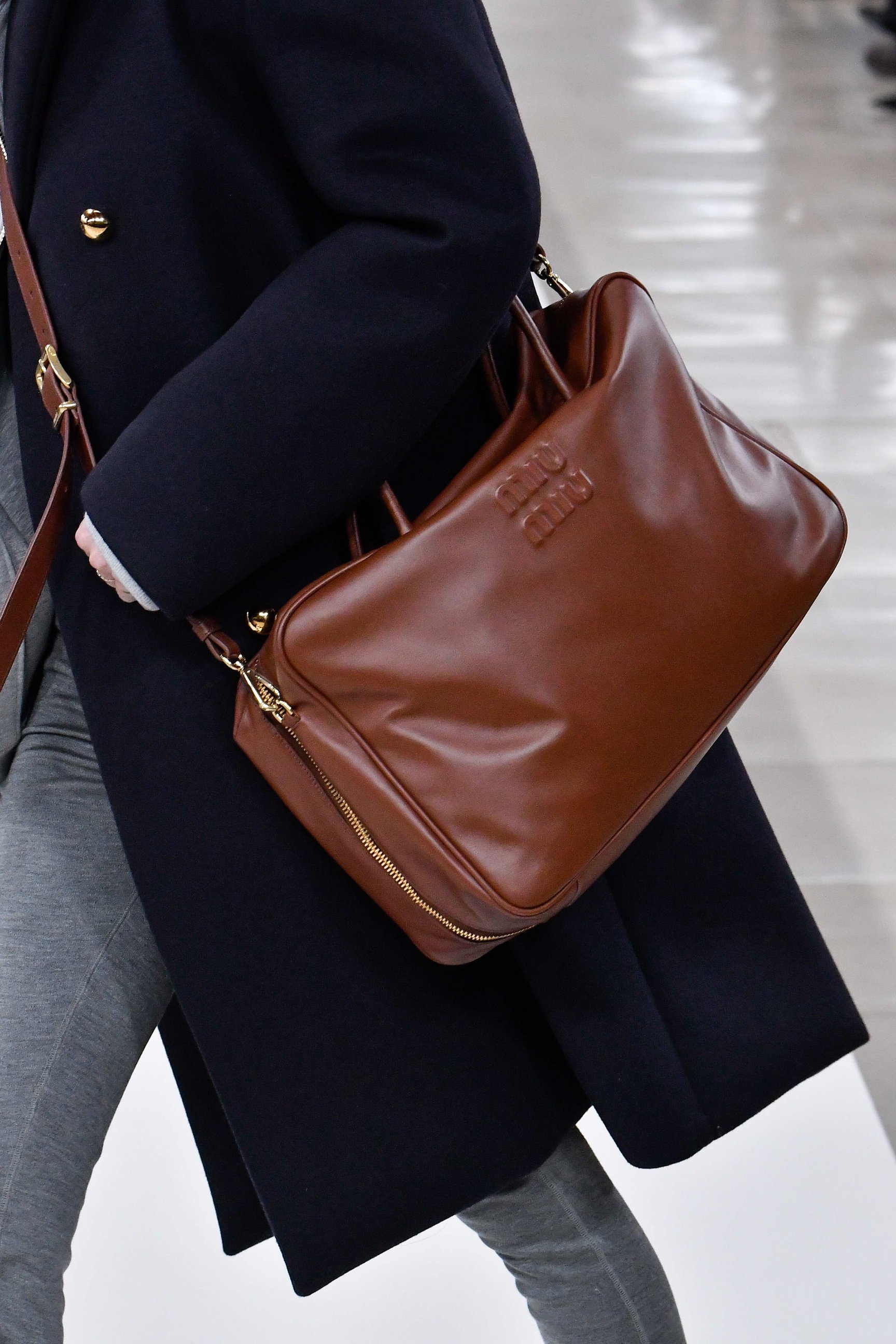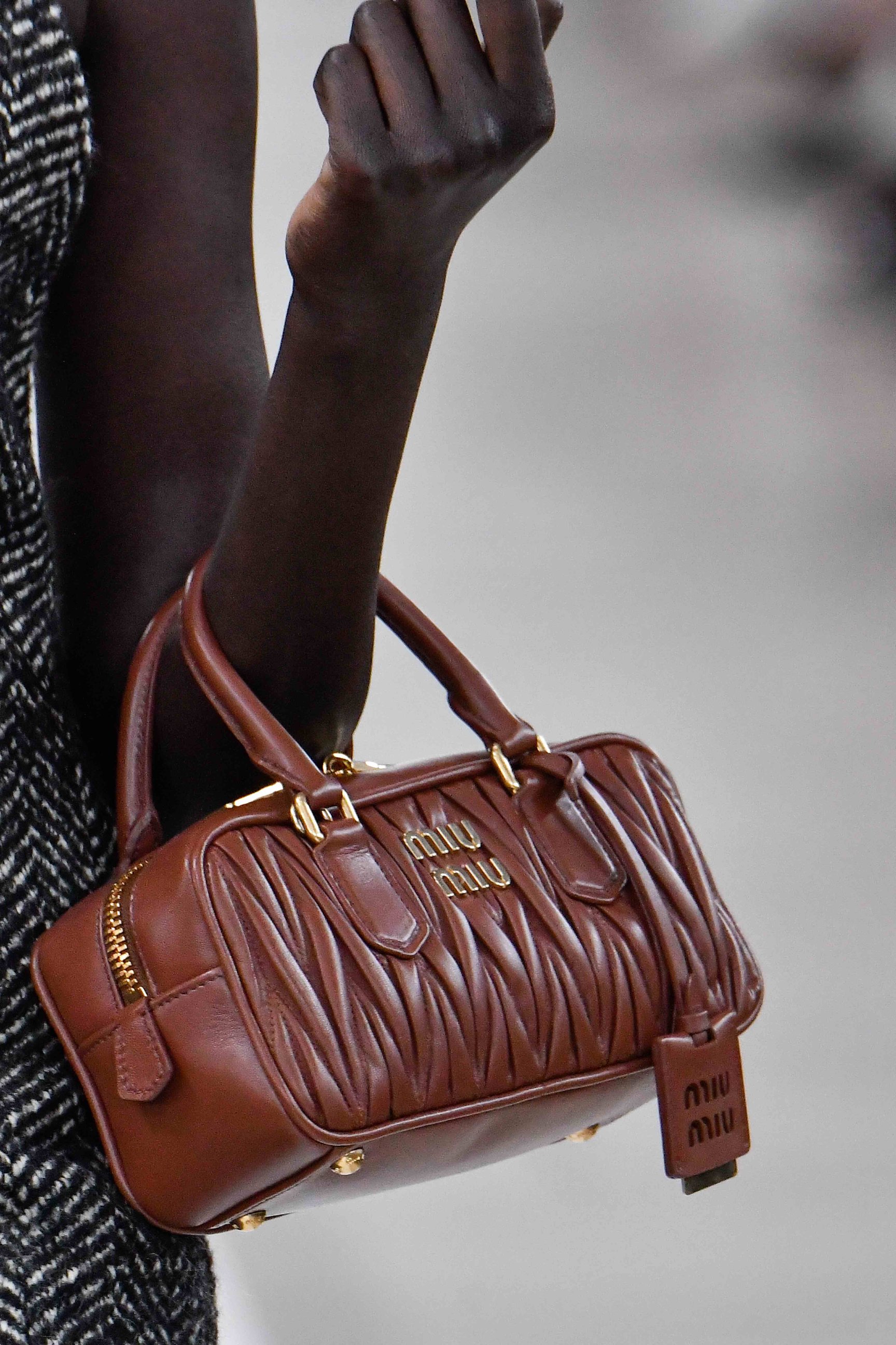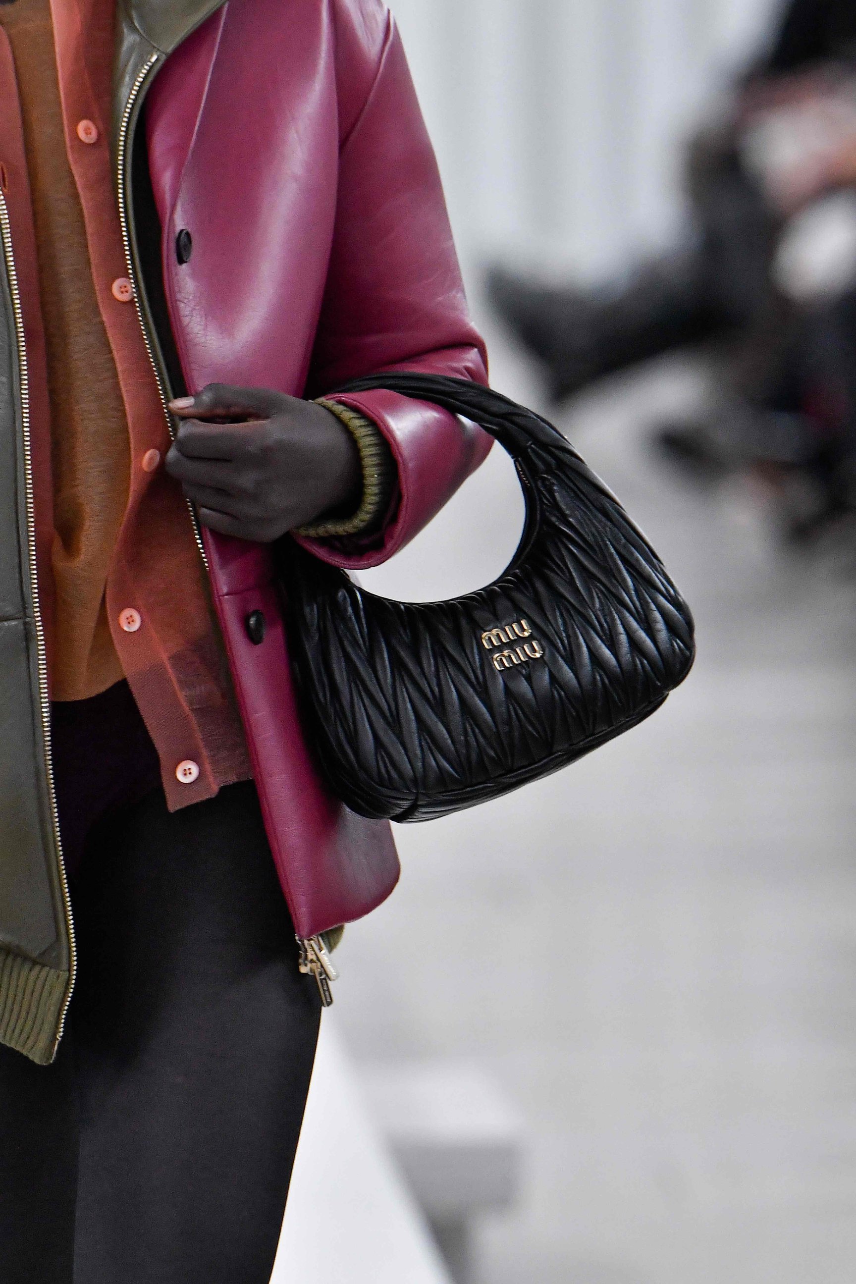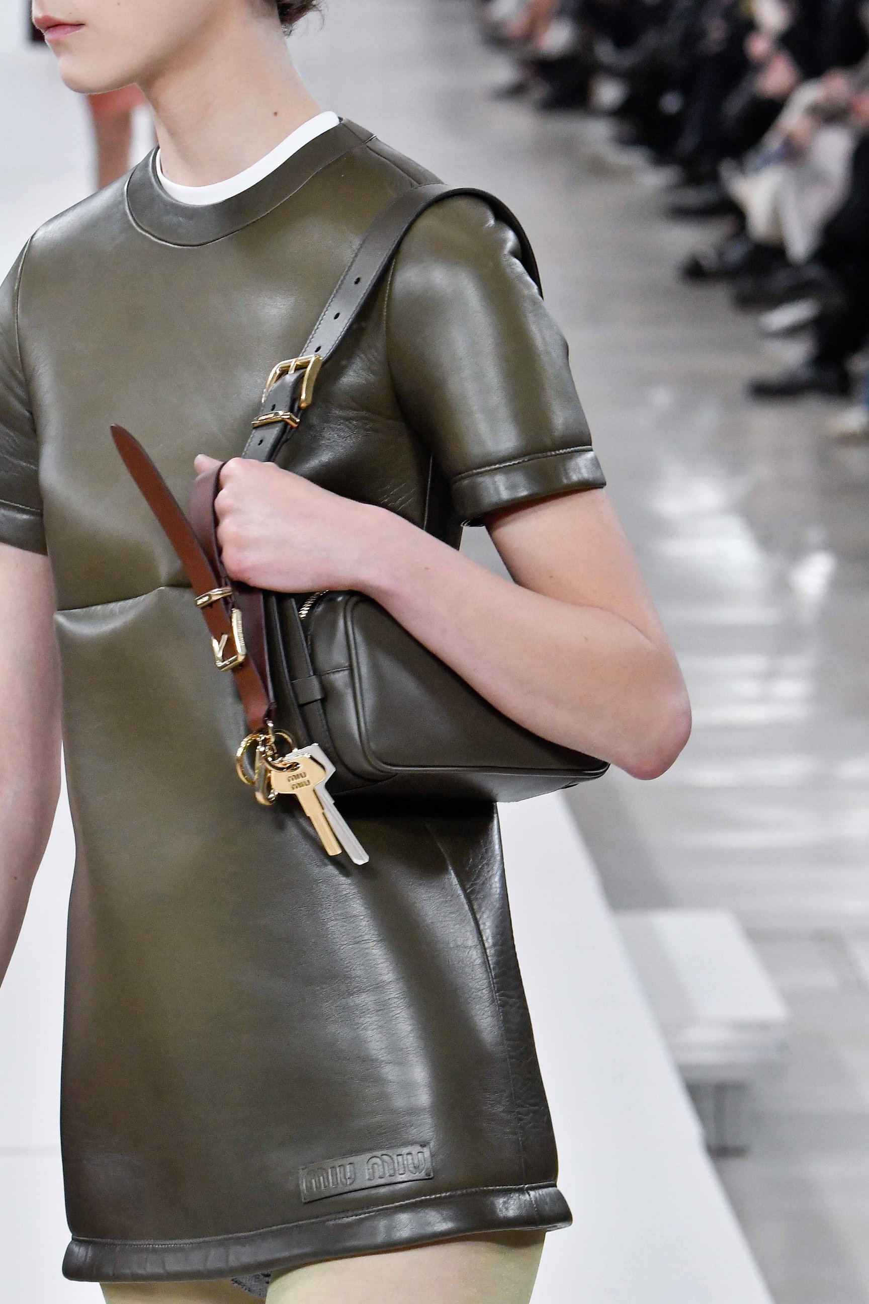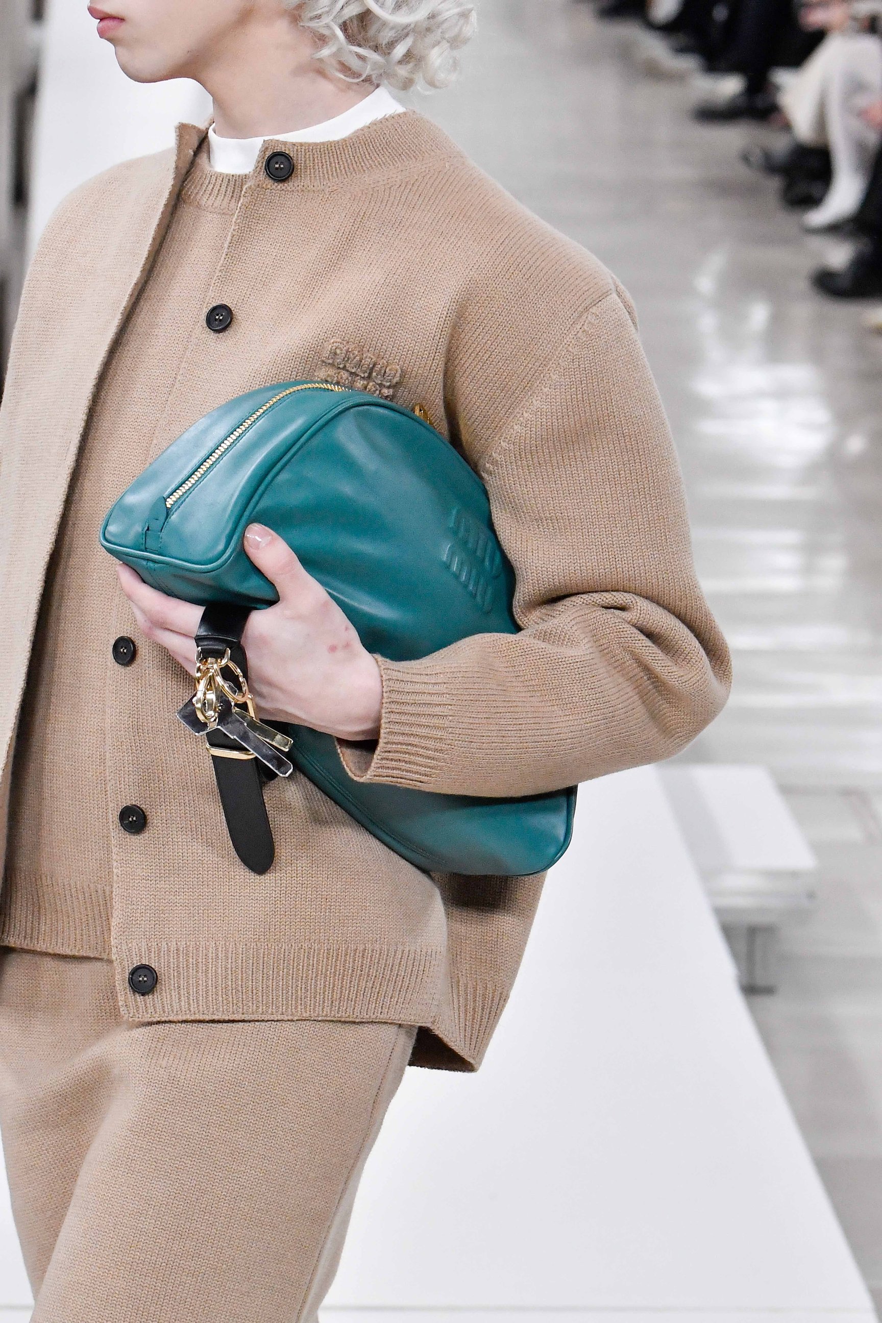 バッグは、マトラッセレザーの「ミュウ ワンダー」やトップハンドルバッグ、ロゴをエンボス加工したボウリングバッグなどをラインナップ。家の鍵がジャラジャラとついているかのようなハードウェアのディテールにも遊び心を感じさせる。内肘にかけるバッグの持ち方は、インナーを見せる大胆な装いとは裏腹に控えめな印象で、キッチュな女性像を演出していた。様々な矛盾をはらんだスタイリングは、私たちが装いに対して抱いている固定観念を大いに揺さぶる。