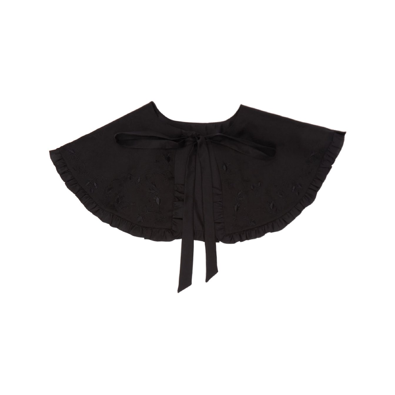 「レンリ?スー(Renli Su)」のオーバーサイズなビッグカラーは、上質なブラックサテンを使用。ベースと同色であしらったジャガード織りの刺繍ディテールが光の角度により姿を現し、高級感ある風貌を演出します。