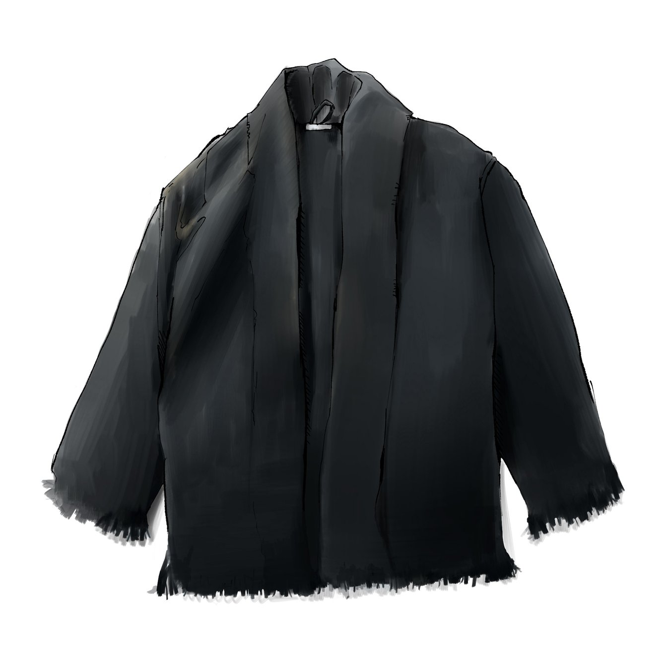 このアイテムの特筆すべき点と言えば、間違いなくその秀逸なデザインにあると思う。たっぷりととられた身幅や裾にあしらわれたフリンジ、ストールにそのまま袖を付け足したようなデザインにもかかわらず、どこか着物のような雰囲気を纏っているようにも感じており、伝統を踏襲したクラシックなアイテムでは得られない高揚感を与えてくれる最たる例であるようにも思う。