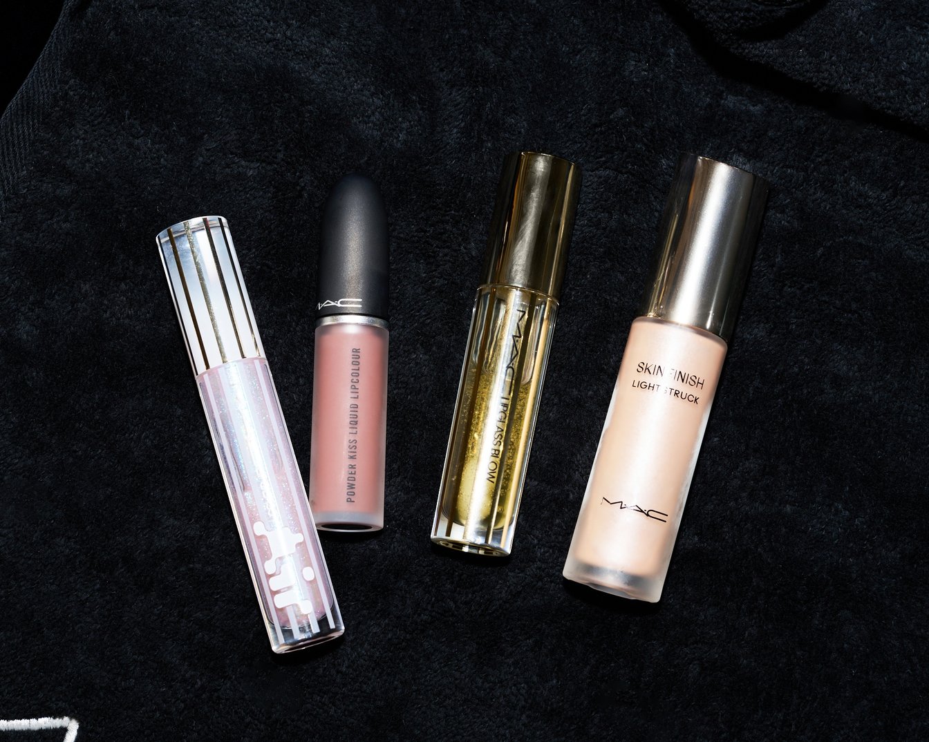 右から:「スキンフィニッシュ ライトストラック リキッド ハイライター ライトスカペード」、「リップガラス ブロウ」、「パウダー キス リキッド リップカラー 953 バフィスト」、「リップガラス エアー フローズン」
