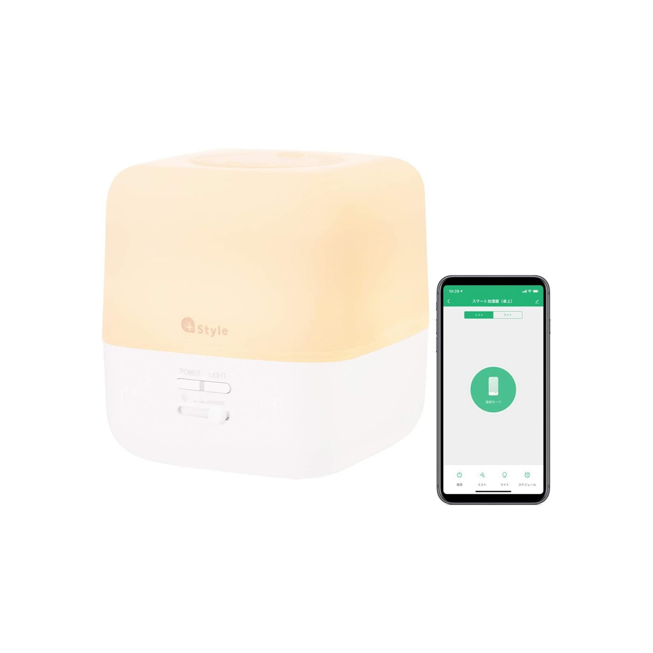 超音波式のコンパクトサイズの「プラススタイル(+ Style)」の卓上加湿器は、LEDライトにもなるすぐれもの。スマホと連携し、外出先からでも操作が可能です。流行りのスマート家電を手軽に取り入れてみましょう!