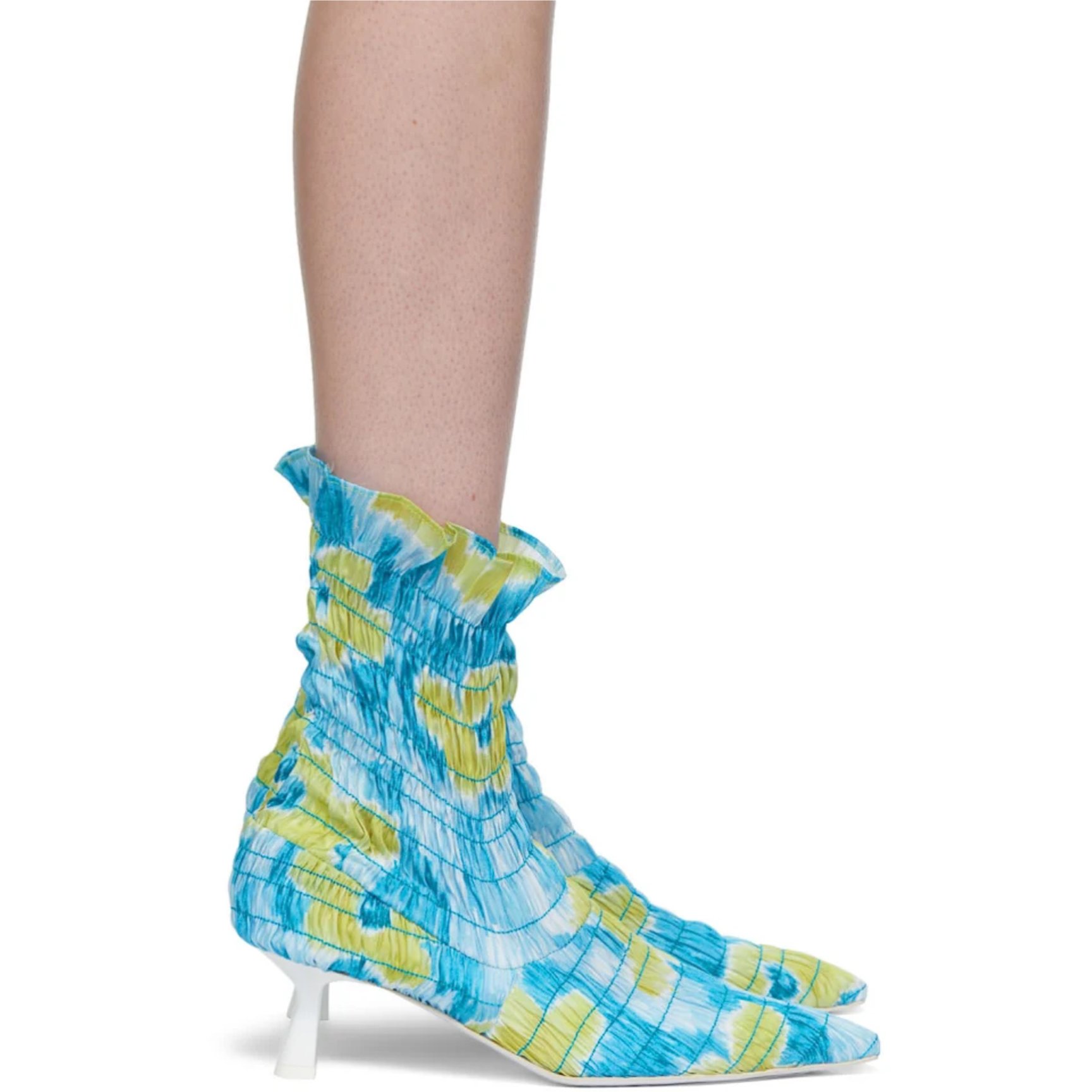 くるぶしよりも少し上丈のショートブーツは、シーズンレスで着用できる優秀アイテム。フリルソックスとドッキングしたようなフェミニンな履き口がポイントです。フレッシュなグリーンベースのタイガープリントと、涼やかなブルーベースのフラワープリント。どちらも足元に爽やかさを演出してくれます。