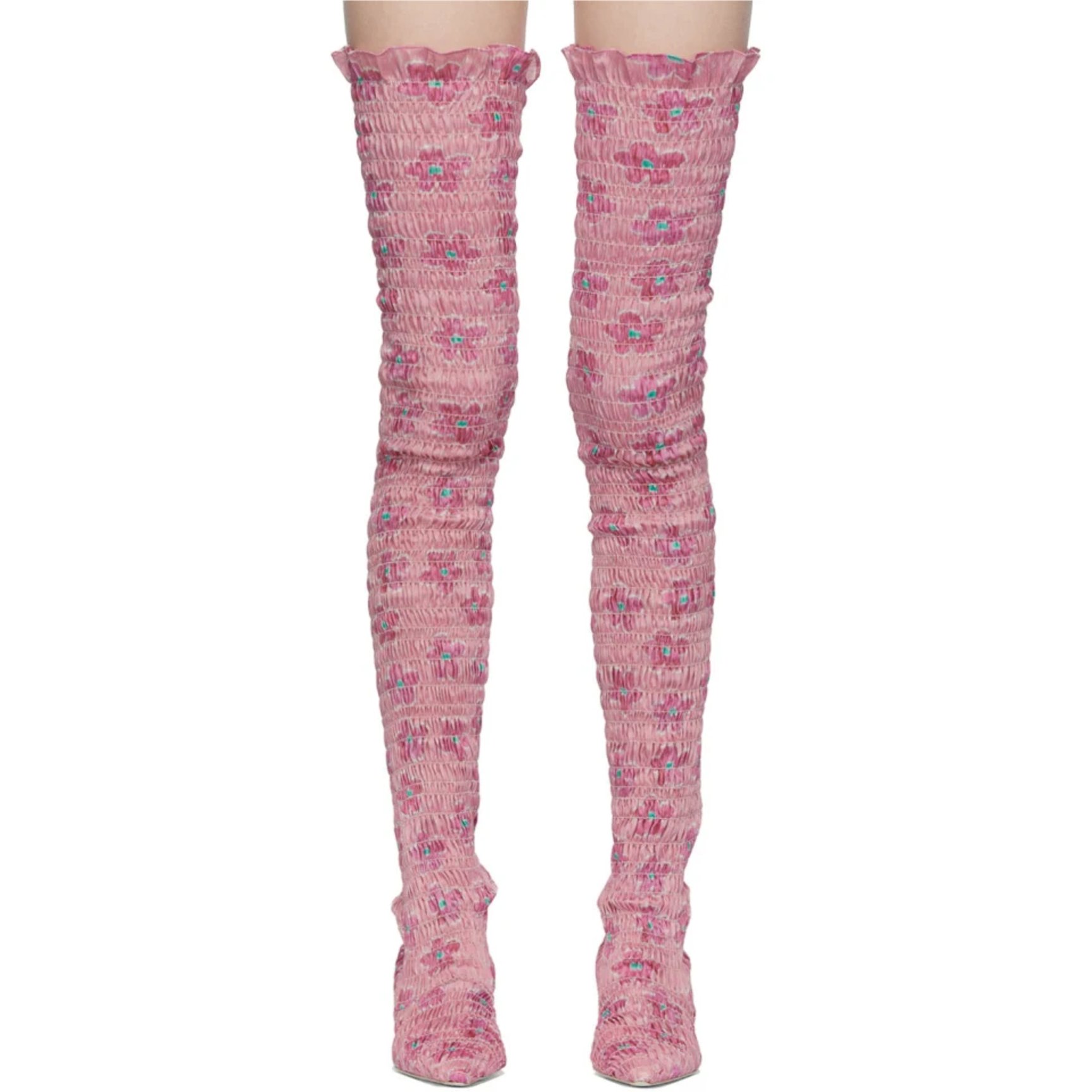 太ももの半分以上を覆う長さが特徴の、インパクト大なサイハイブーツ。伸縮性のあるファブリックを使用しているので、ファスナーなどの金具が無く脱ぎ履きも意外と楽ちんです。今季トレンドのミニボトムとの相性もよく、合わせるとレトロモダンなスタイルが楽しめます。