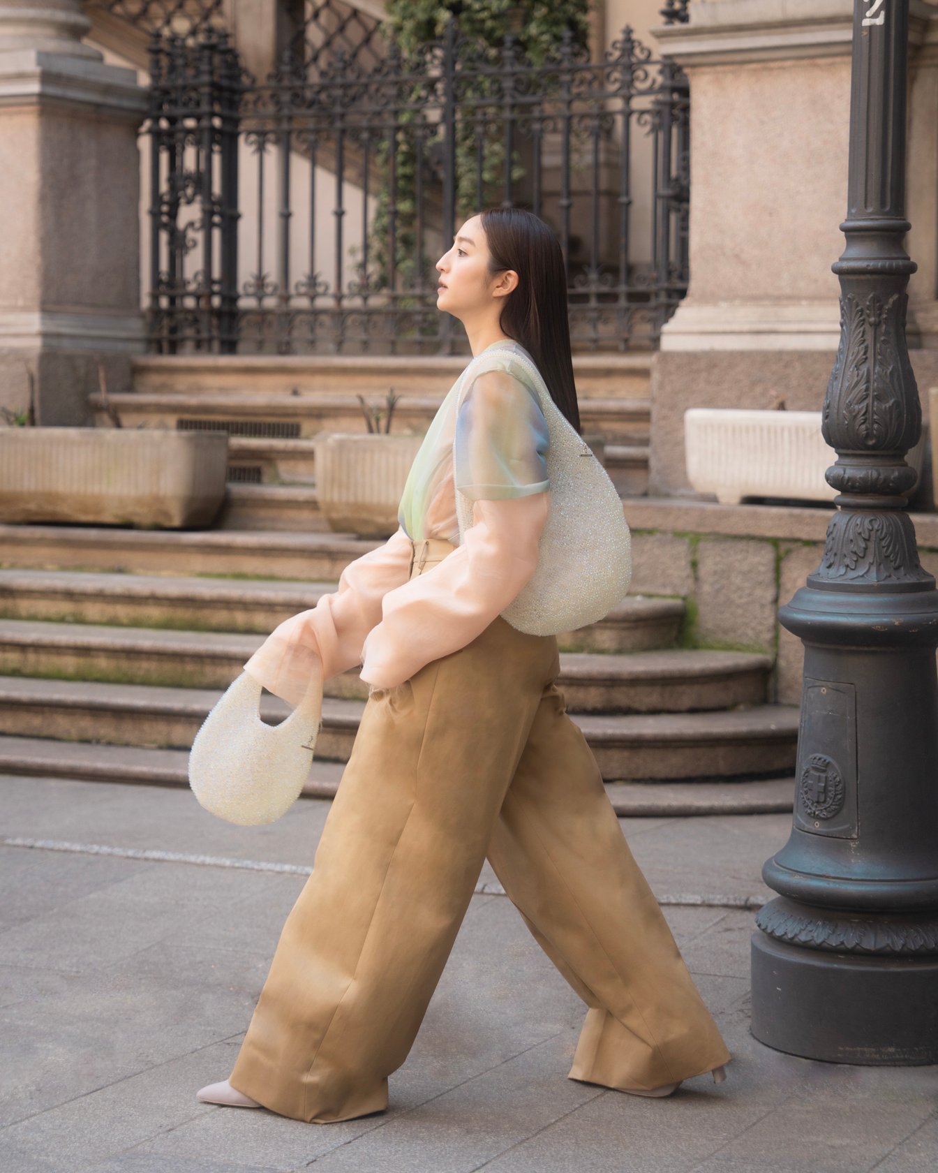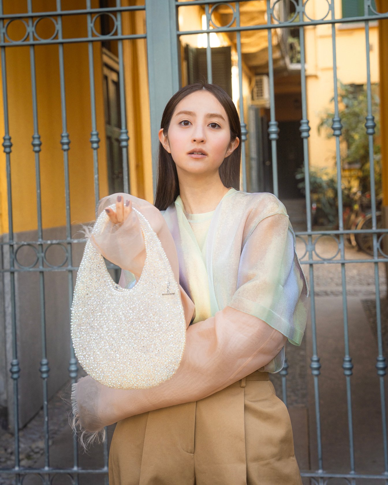 イタリア語で風船を意味する新作ワイヤーバッグ「パッロンチーノ(PALLONCINO)」は、ふんわりとしたラウンドシルエットが特徴。アート作品のような美しさと、ハンドルが一体化したミニマルなデザインが魅力です。そのモダンな佇まいは、モードなスタイルにもぴったり。堀田さんは、2025年春夏のシアーなトップスとジャケットをレイヤードし、ワイドパンツを合わせたクールなスタイリングに、オーロラ色に輝くパッロンチーノをサイズ違いで2個持ちして、ミラノの歴史ある小道や運河を巡りました。バッグの持つ柔らかな質感と、抜け感のあるスタイルが洗練された都会的な雰囲気を演出します。