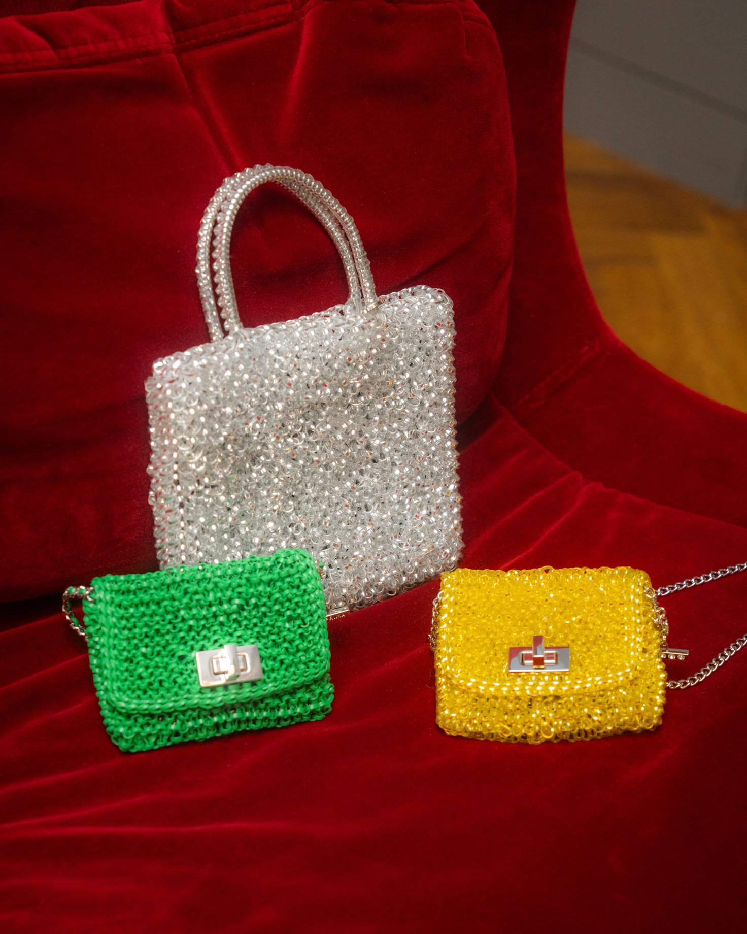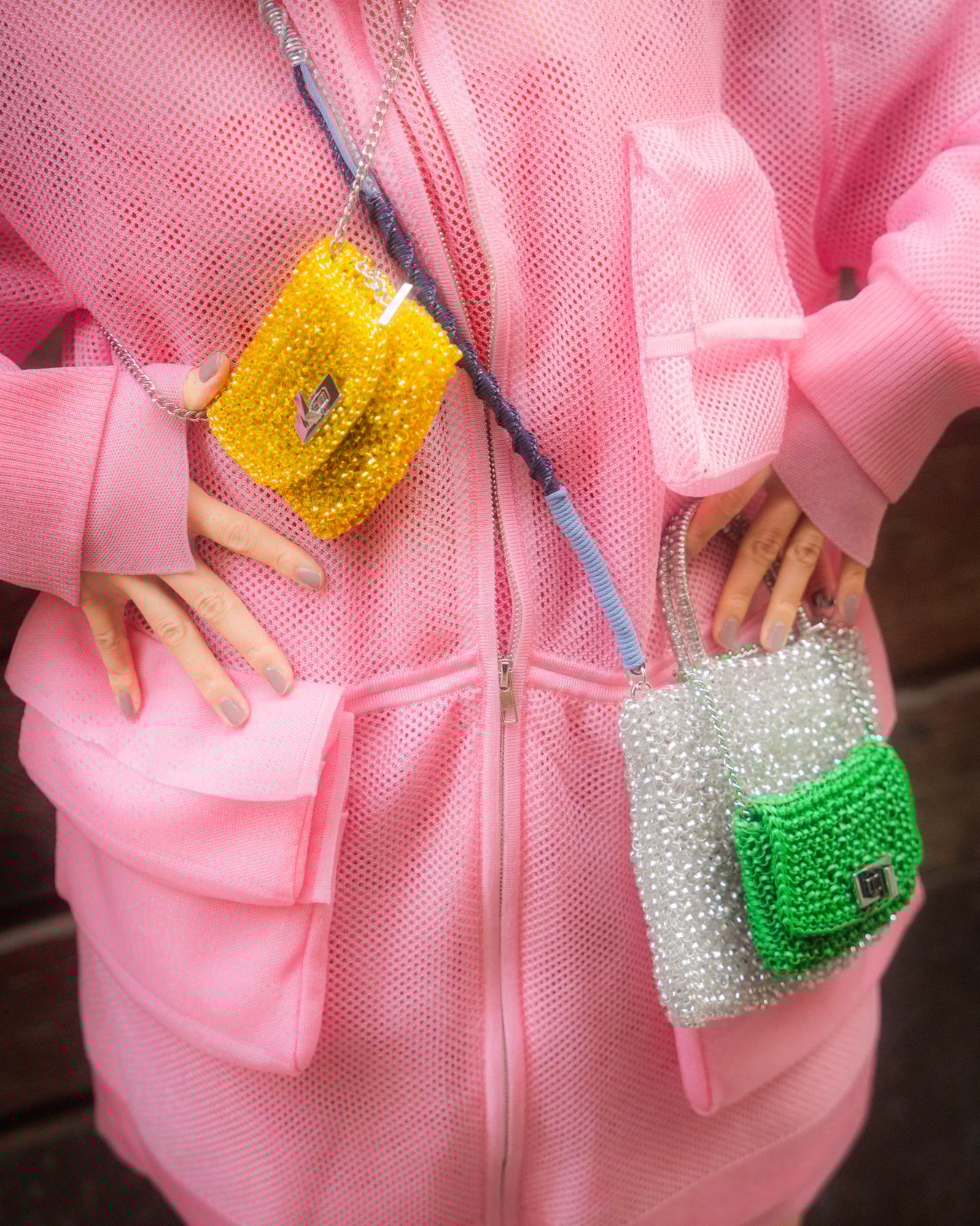 ルッケット ミニアトゥーラ(左からマスタードイエロー、マットグリーン W10×H7.5cm) 3万5200円、スタンダード ミニアトゥーラ(シルバー W18.5×16cm) 3万6300円、ワイヤー ストラップ(マットフラミンゴ×マットアッチャイオブルー 124cm)3万800円、ジャケット 13万7500円、トップス 12万4300円、スカート 7万1500円