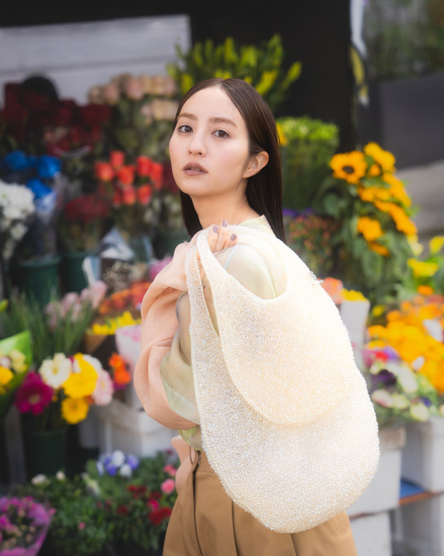 堀田さんはアンテプリマのワイヤーバッグについて「不思議な魅力のあるバッグ」と語ります。「品があって、きちんとした場にも映える上、カジュアルなコーディネートにも合わせられるところが好きです。アンテプリマ独自のワイヤーコードをニッティングすることで伸縮性があり収納もしやすく、チェーンの長さが変えられるため、見た目だけではない実用性が備わっているところも素晴らしい。そして絶妙に透ける素材感も可愛く、持っているだけで気分が上がります」。