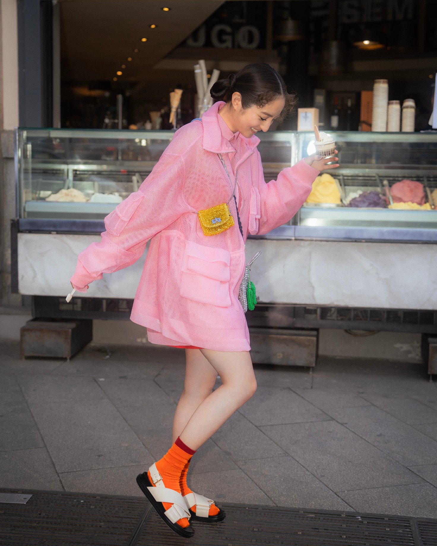 アンテプリマのロングセラーである「スタンダード ミニアトゥーラ(STANDARD MINIATURA)」と「ルッケット ミニアトゥーラ(LUCCHETTO MINIATURA)」。手編みで仕立てられ、光の角度によりジュエリーのようにキラキラと輝く身に付けるだけで上品でラグジュアリーな印象を与えてくれる逸品です。ミニバッグは、好みの色を2個持ちしてスタイリングするのが旬。華やかなピンクのアウターをミニドレスのように纏い、ジェラートを楽しみながらミラノの石畳の道を散策しました。