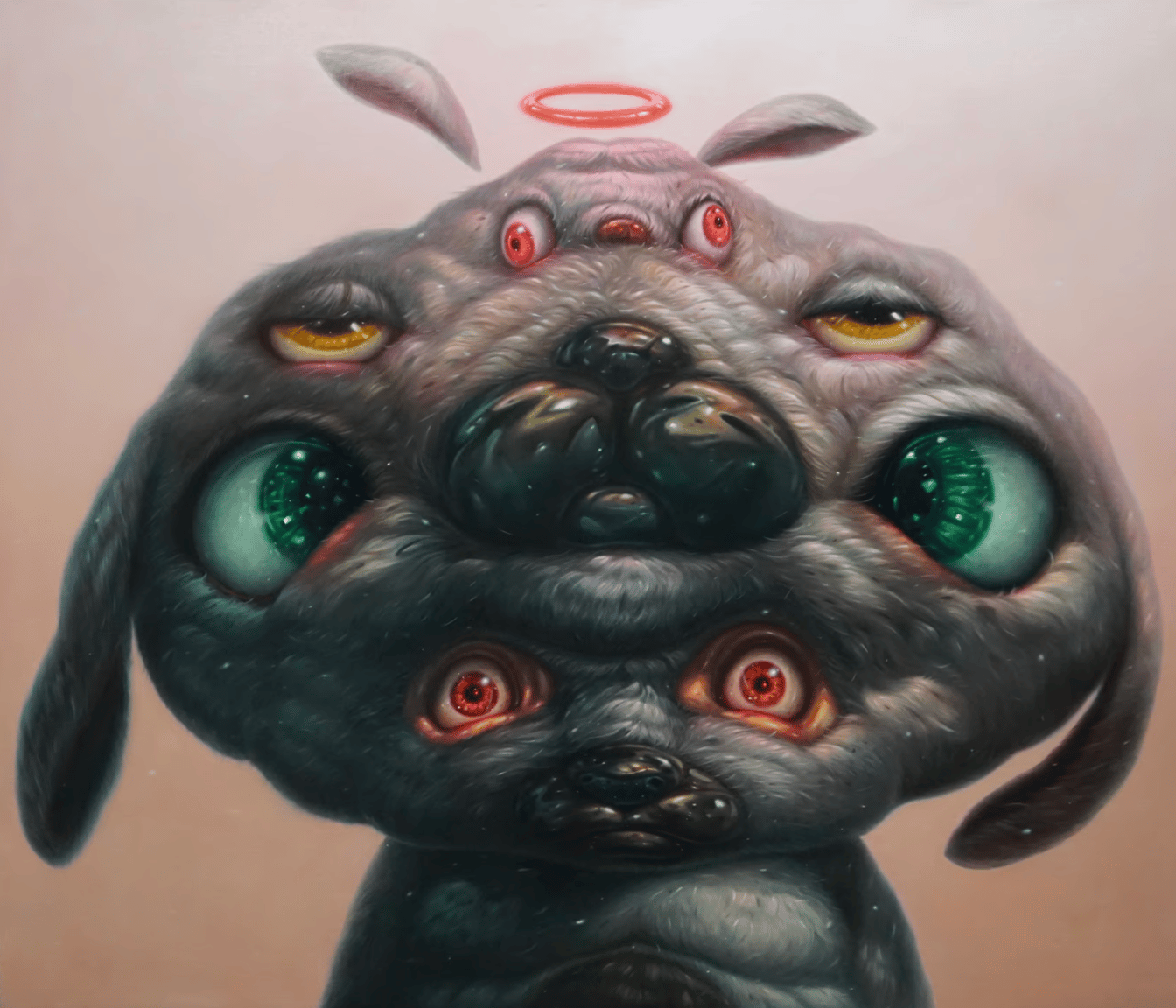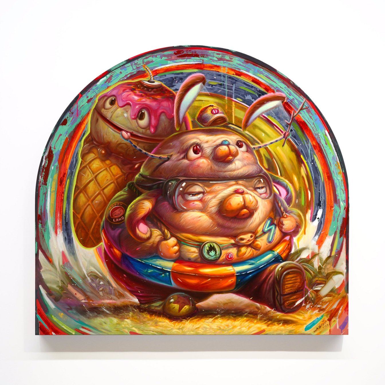 アオフ?スミスが取り扱うテーマは「環境問題」。今回の個展では「人間が作ったものが将来、地球上にどのように残っていくか」ということを中核に置き、ここ数年一貫して描いているウサギと犬をミックスした独自のキャラクターと共に表現している。