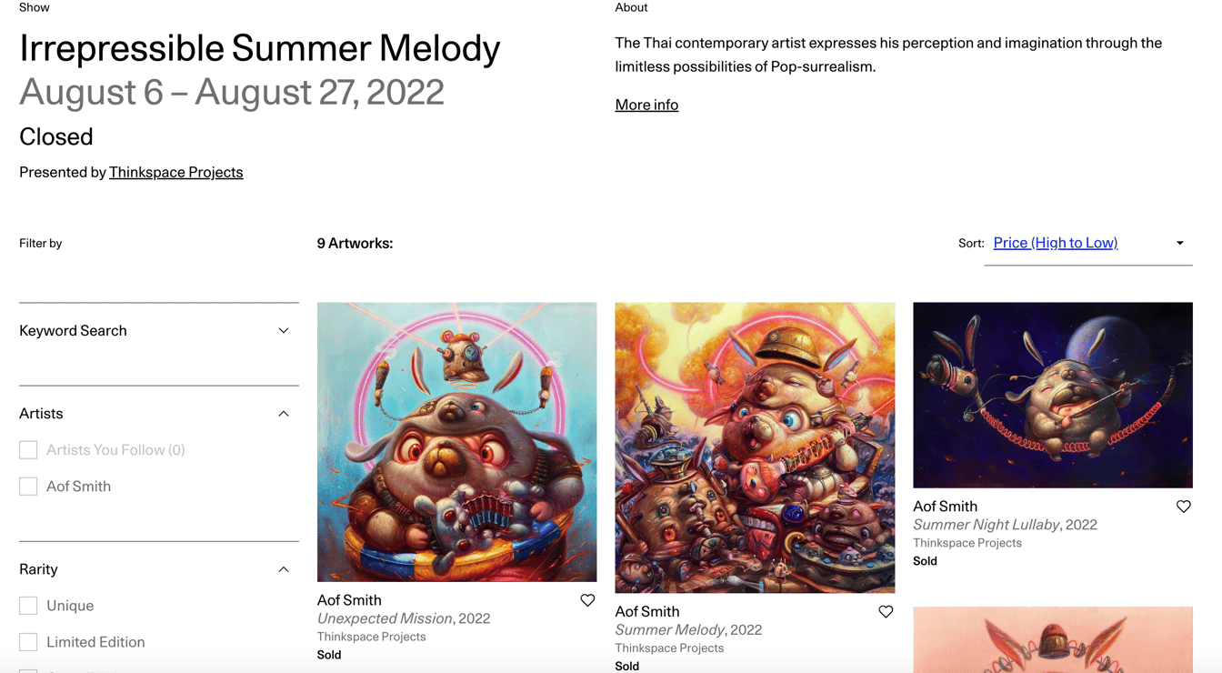 現在のタイは、美術市場が盛り上がりを見せていると言う。若手作家の台頭、若者文化の輸出などで国際的に注目を集める国になっており、欧米の文化を吸収しながら、独自の進化を遂げてきたアジアの作家の筆頭として、アオフ?スミスの注目度は高まっていると荻田氏は話す。「当然、日本人が描く絵とも異なるし、だからと言ってアメリカナイズされているわけでも、アジアっぽいわけでもなく、独自性がある」とした上で「彼の父が美術教師だからか絵の具の扱い方も上手く、絵画のテクニックもある」と評価した。