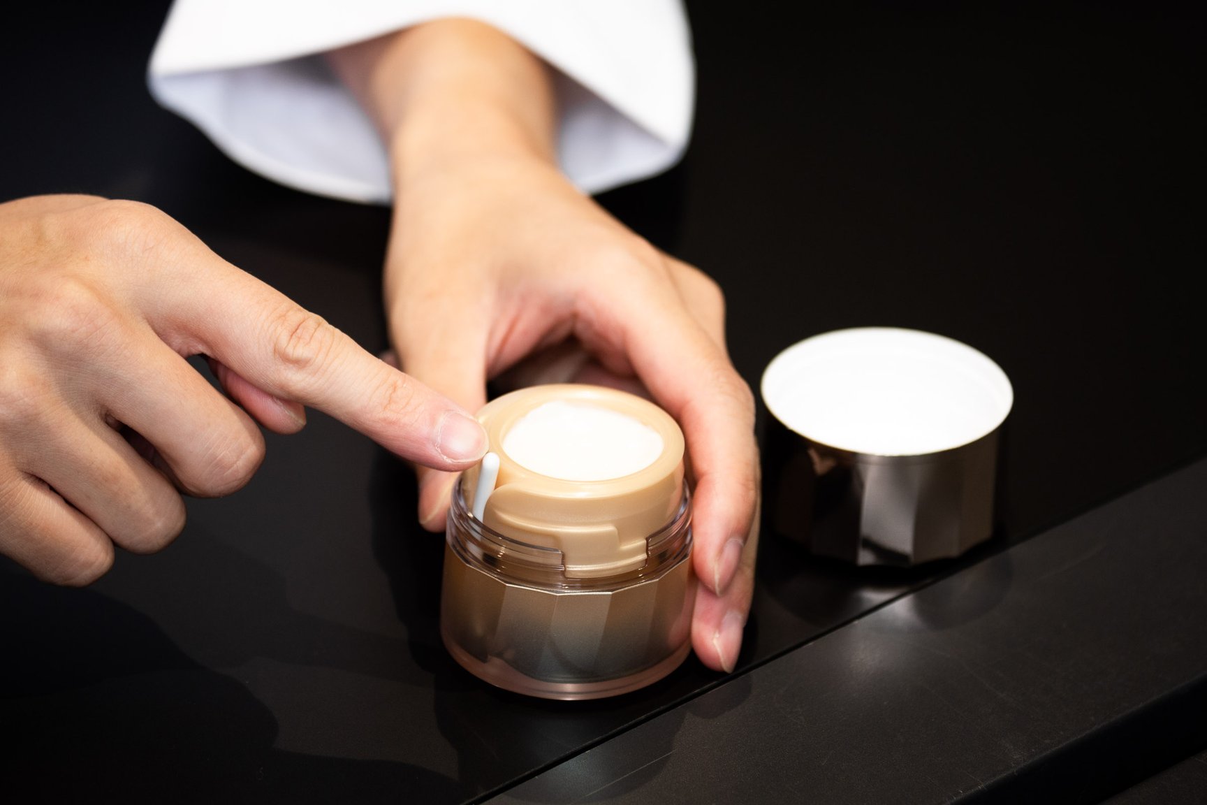 自分で試したり、友人や知人の声を聞いてみて感じたのは、化粧品って「中味も大事だけど、使っていて楽しくなければ手に取らない」ということだったんです。使い勝手の良さや心地よさをお手入れする楽しさに結びつける、そのひとつに容器もあるんだってこと。皆さんの悩みやもっとこうしてほしいというニーズ、楽しいと思ってもらえること、それを形にすることで、新たな価値を生み出すことはできないかな、と。そこで生まれたのが自立式スパチュラの容器でした。