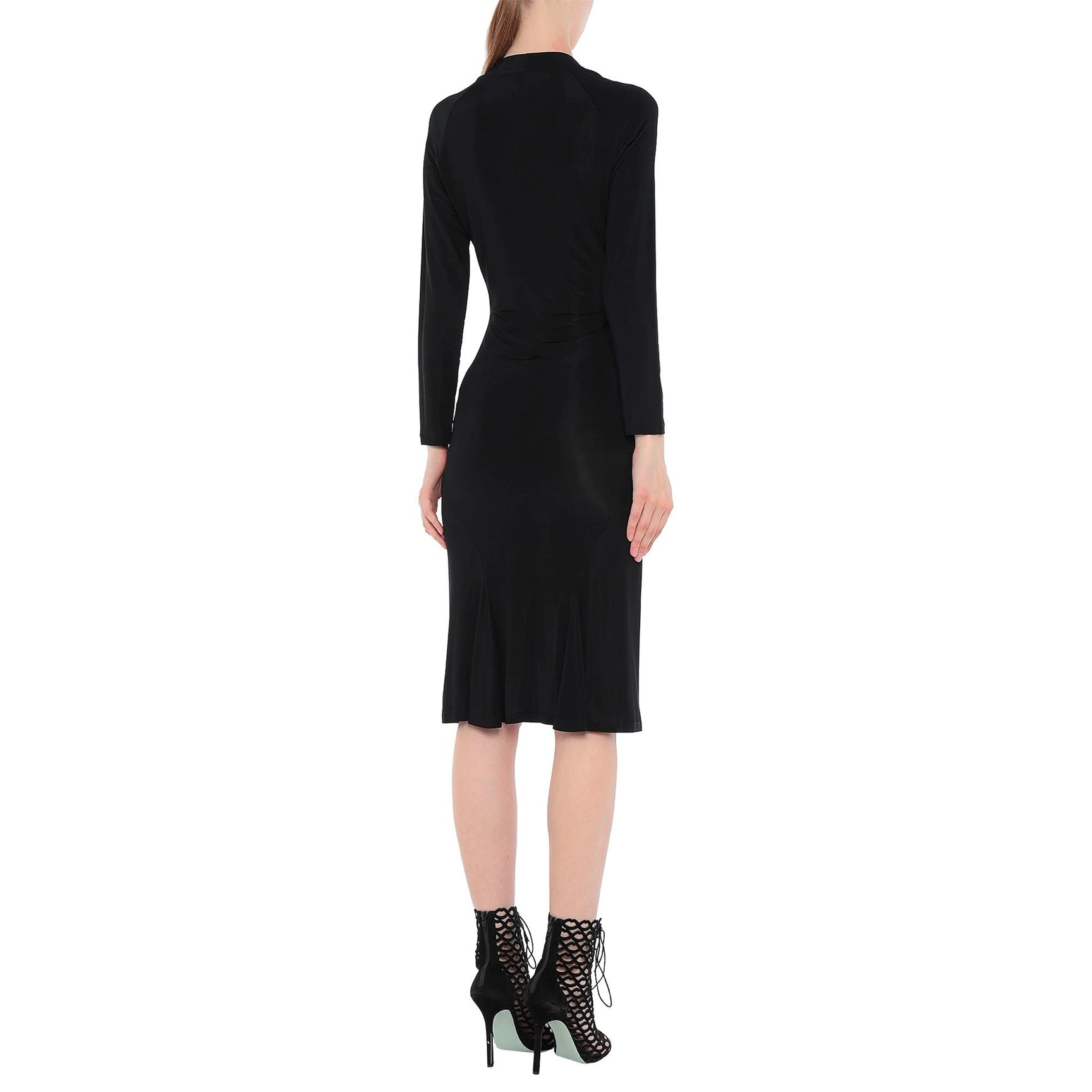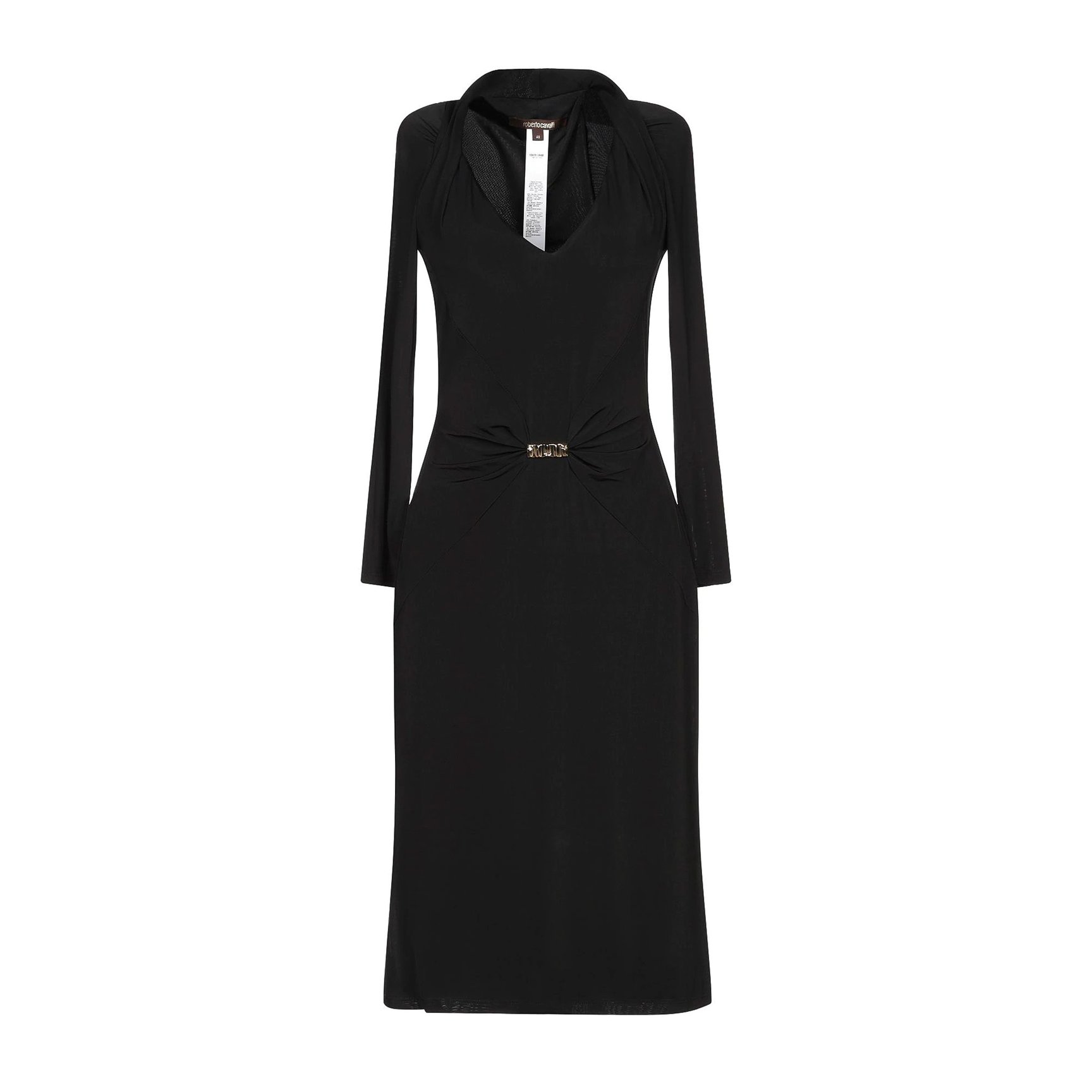 最後にご紹介するのは、都会的な洗練を漂わせる「ロベルト?カヴァリ(Roberto Cavalli)」のブラックドレス。肌にぴったりとフィットする一着は、ウエストのゴールドバックルと深く開いたネックラインで、センシュアルな佇まいを完成させます。