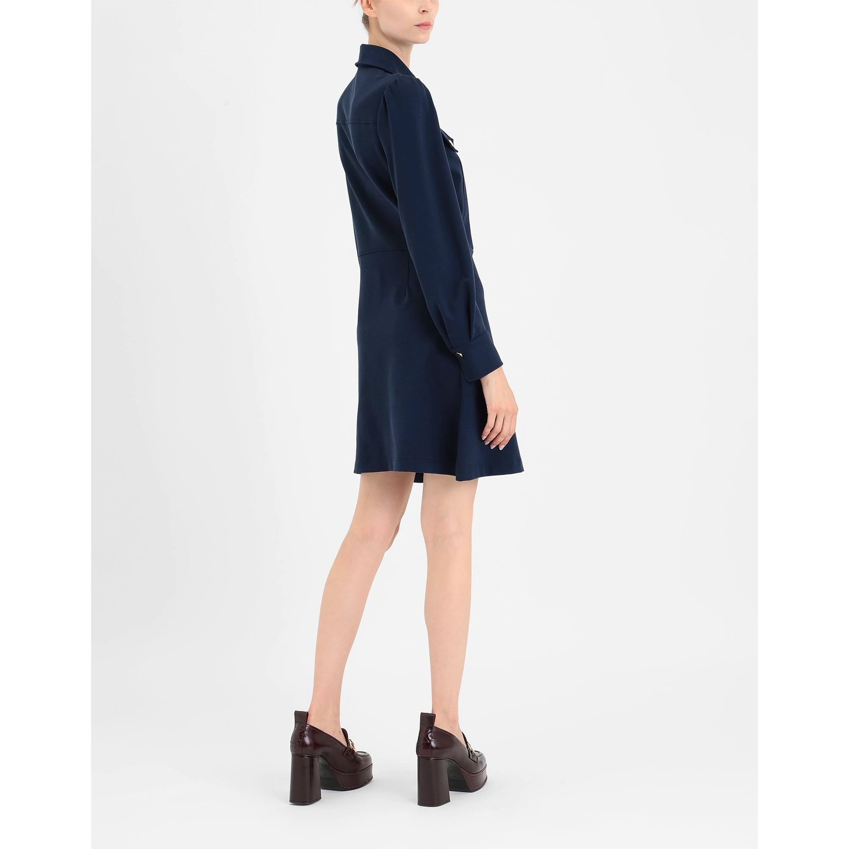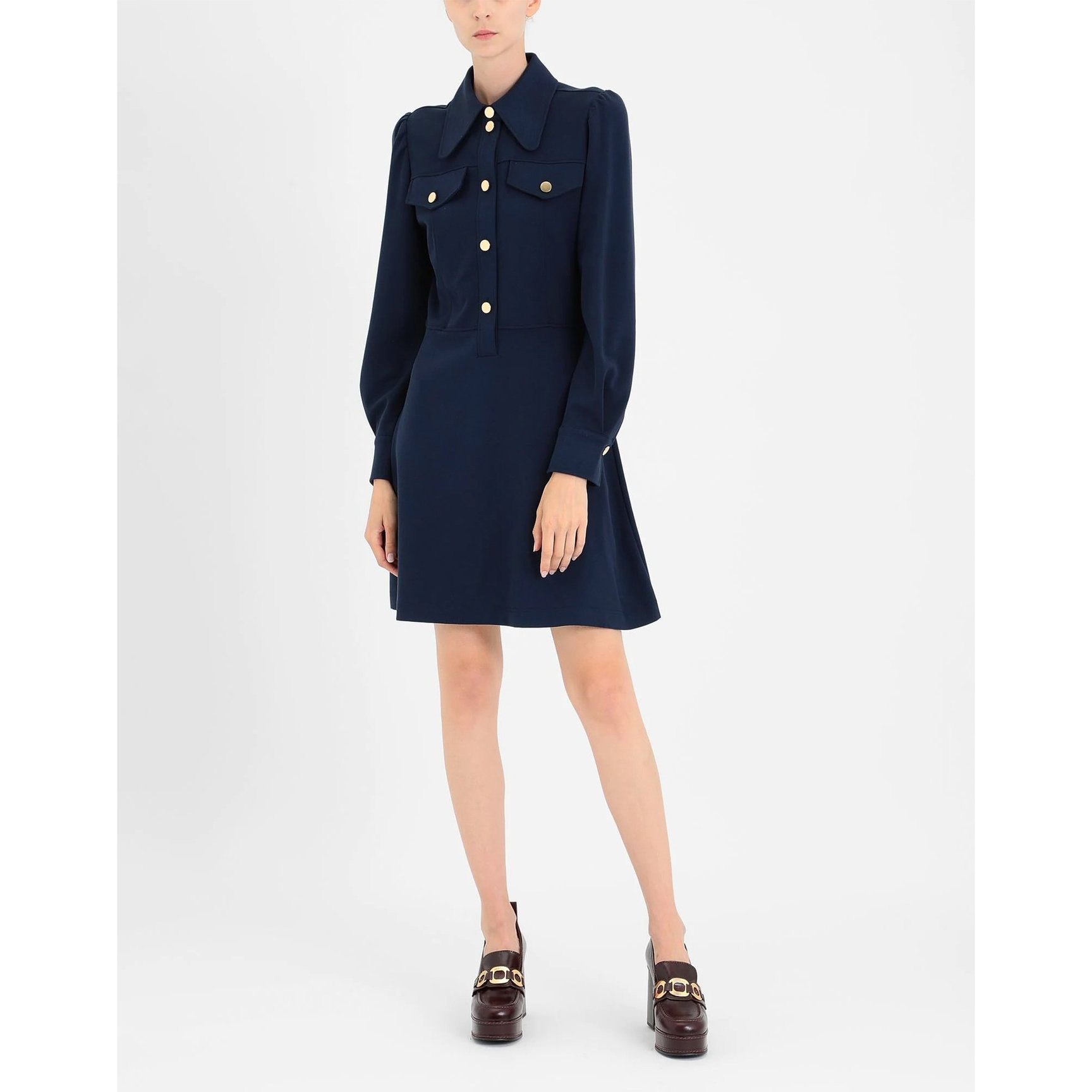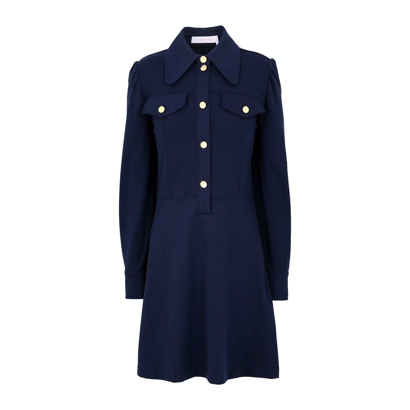 ゴールドのボタンがグラマラスに輝く、「シーバイクロエ (See By Chloé)」のひざ上丈ワンピース。襟元やショルダーなどの細部からクラシカルに仕立てた、格式ある懐かしさ香る一着は、上品なダークブルーのストレッチ生地で着心地も申し分なし。