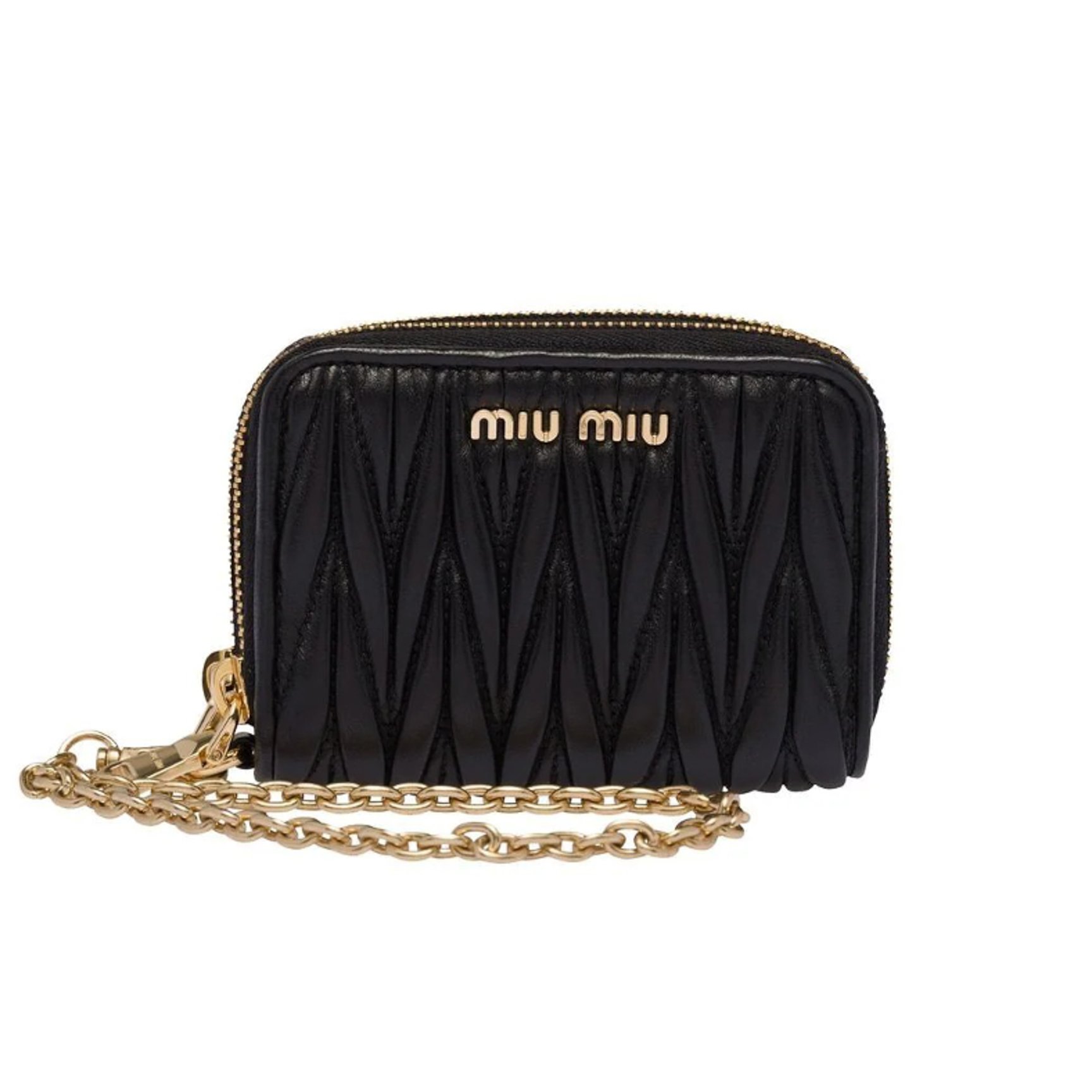 可憐なウィメンズによく似合う、「ミュウミュウ(MIU MIU)」のカードケース。ナッパレザーの「マテラッセ」に、ゴールドのロゴとチェーンがエレガントに輝きます。チェーンのリストストラップはブレスレットのような華やかさを放ち、アコーディオンタイプのカードスロットでカードや紙幣もすっきりと収納できます。