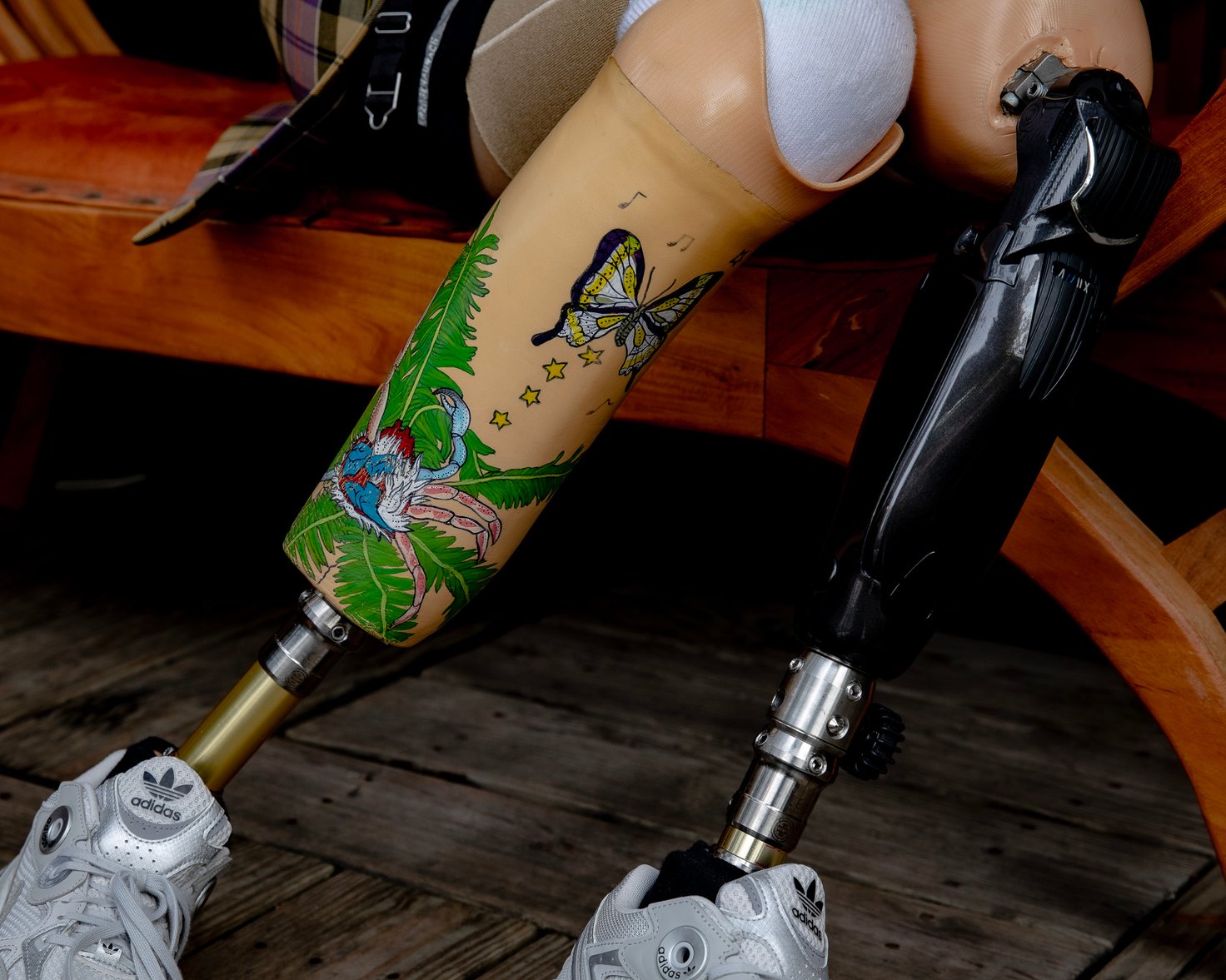 「大人になってからハマった」という「ヴィヴィアン?ウエストウッド(Vivienne Westwood)」のジャケットを羽織り、個展会場に現れた片山。義足にペイントされたカニは、自身が「蟹座」であり、蟹のハサミが自身の左手に似ていることから気に入っているモチーフだという。彼女はこのユニークな義足で国内外を飛び回っている。