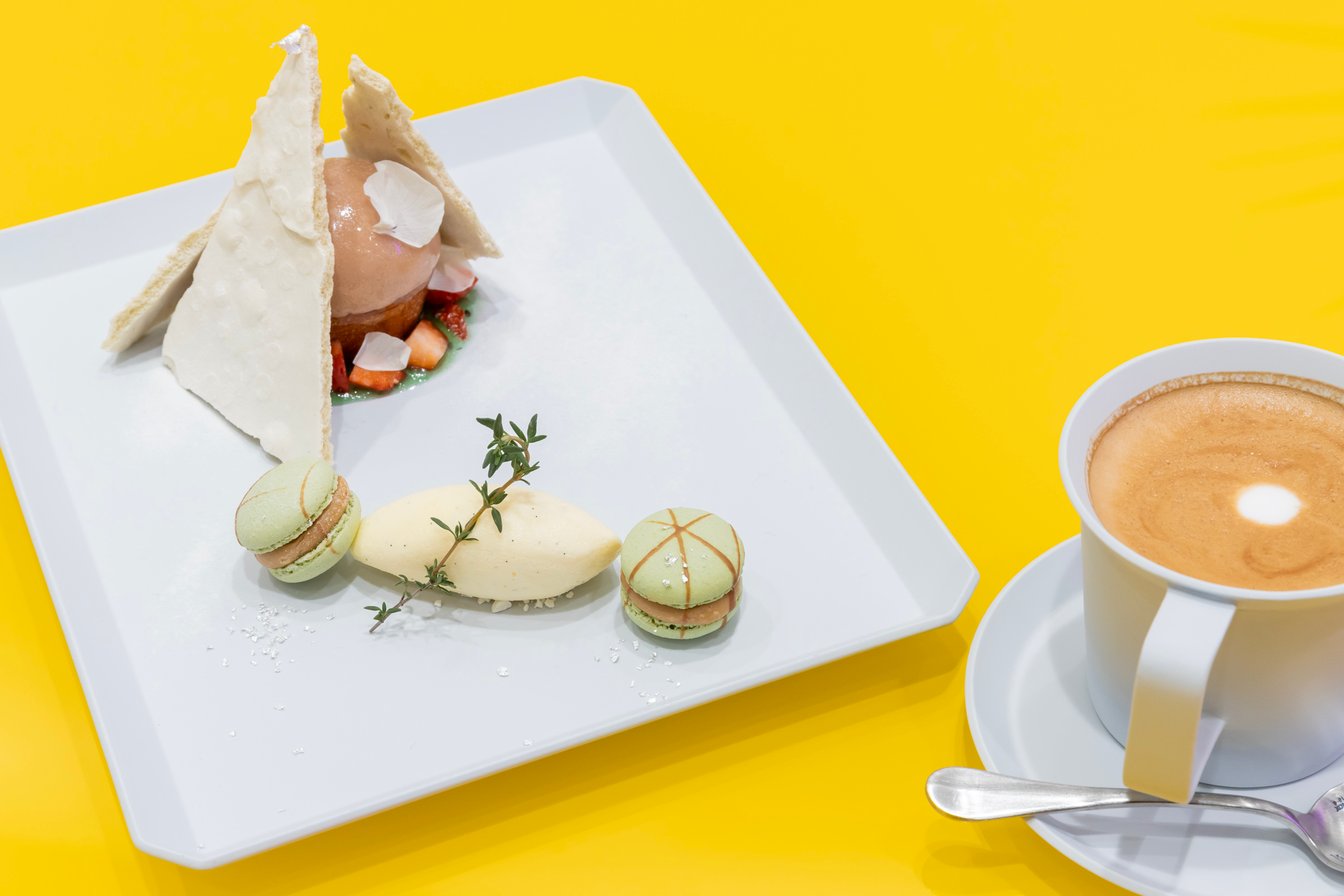 せっかくポップアップに来たのなら、立ち寄りたいのが「ボッテガ カフェ」。ブランド初のカフェとして世界でここでしか体感できないスペシャルな空間です。場所は、本館に隣接する阪急メンズ大阪2階にあるブティックの中にあり、ブランドの発祥地?イタリアにゆかりのあるドリンクやスイーツを堪能できます。今ならホリデー限定のメニューも提供中。ポップアップでお買い物のあとには、一息つきがてらブランドの世界観に浸ってみては?