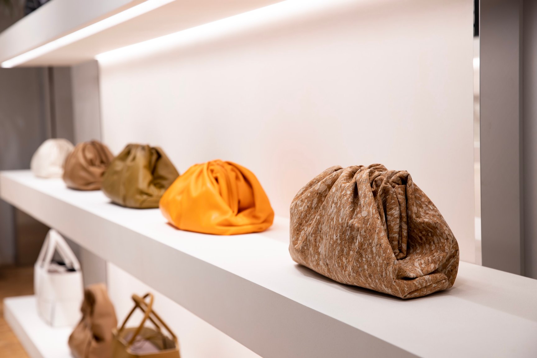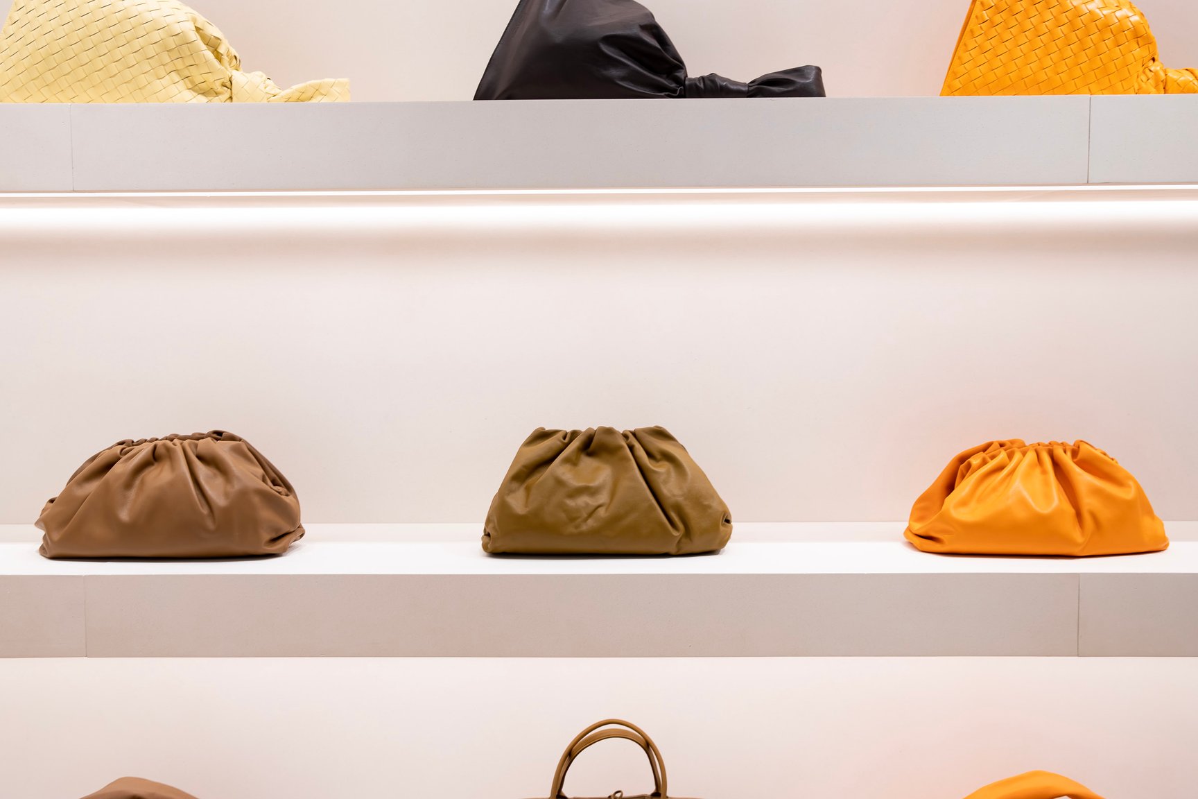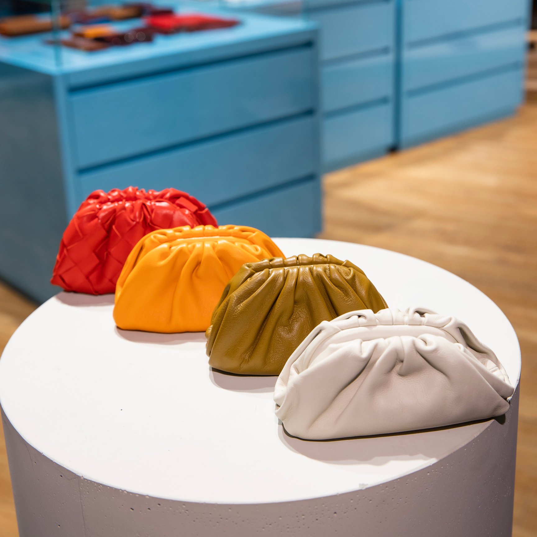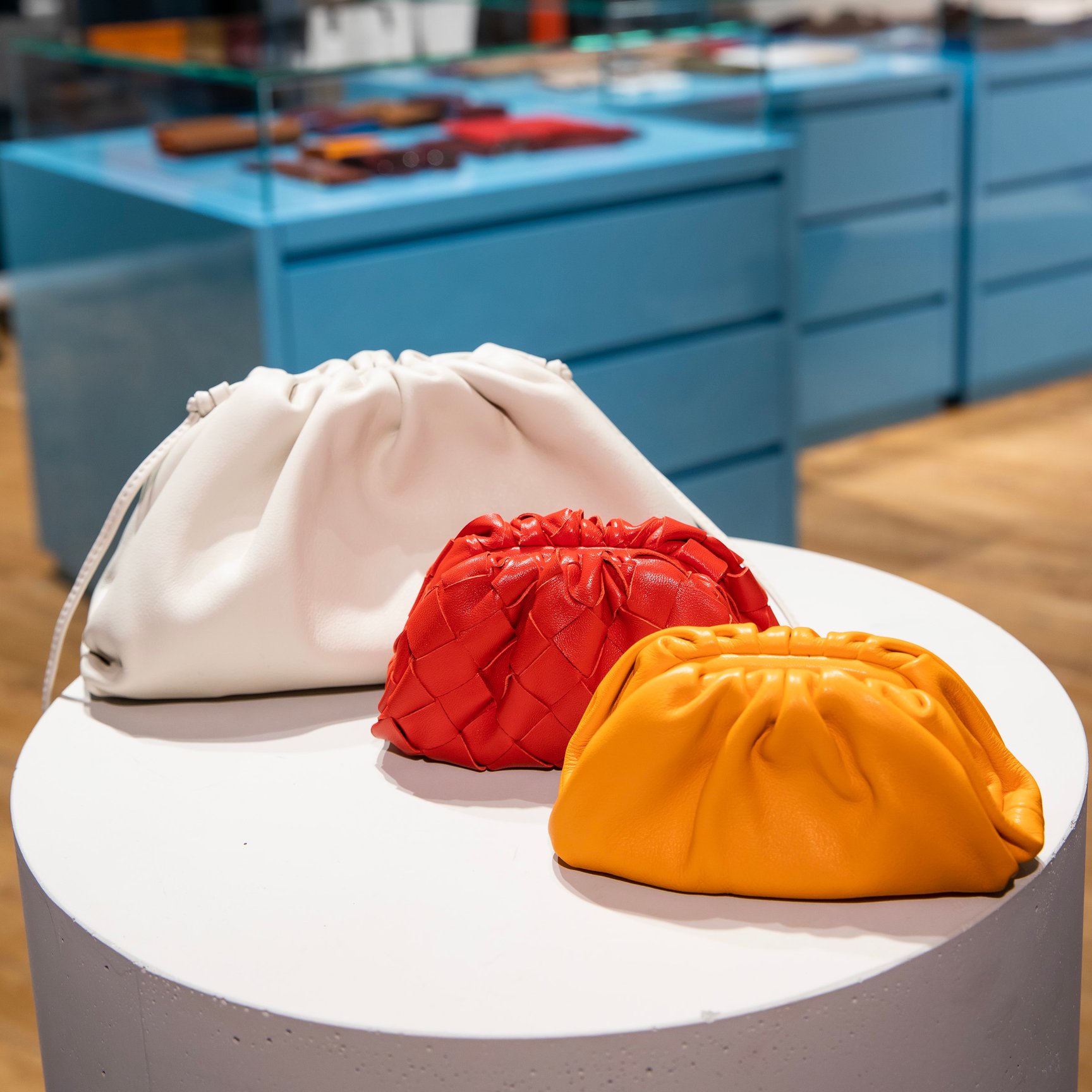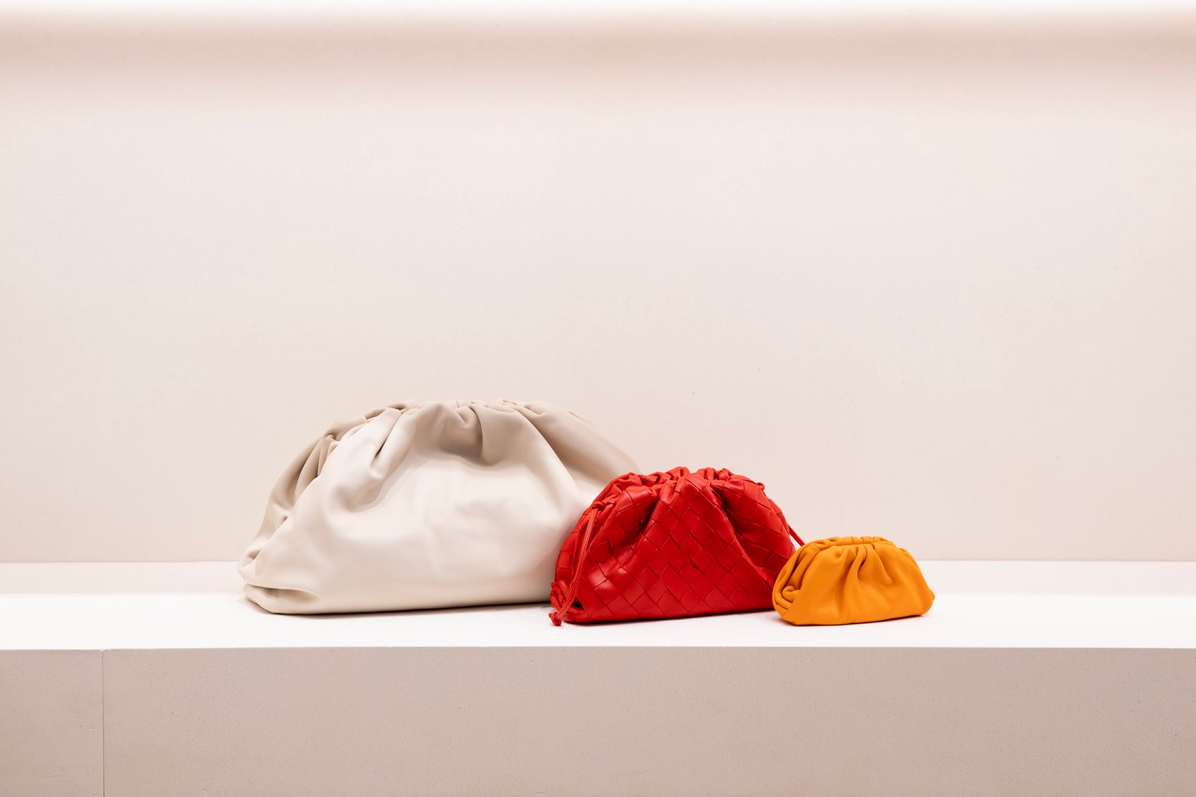 左「ザ?ポーチ 20」(16万8,300円)、中央「イントレチャートナッパ ミニ ザ?ポーチ」(8万6,900円)、右「カーフ ミニ ザ?ポーチ」(7万4,800円)