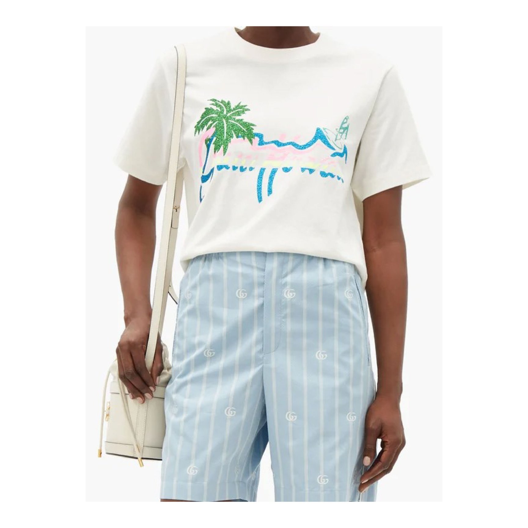 1980年代のネオンサインからインスパイアされたTシャツにはグリッターで「Gucci Hawaii」の文字が。一見するとグッチと分からないところも推しポイントです。