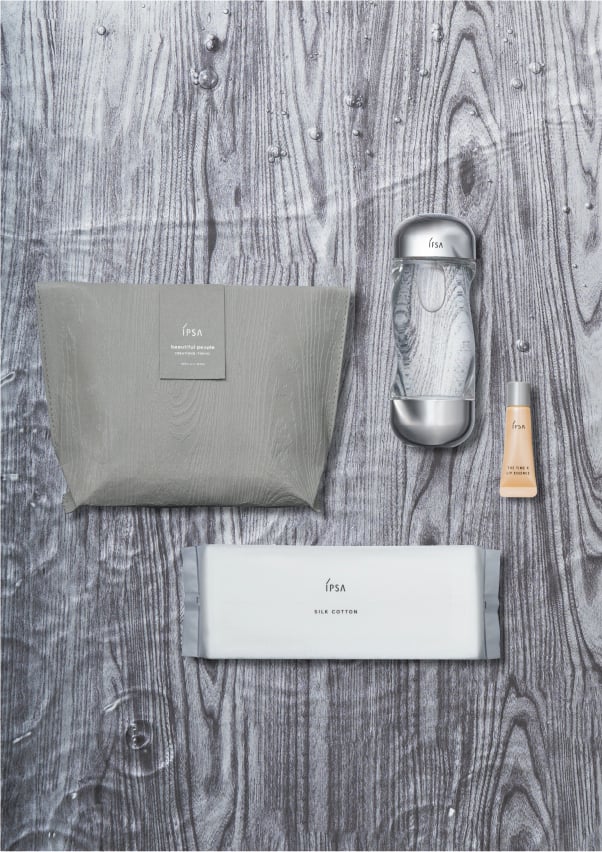 「『ビューティフルピープル(beautiful people)』とコラボレーションした、4色から選べるコスメバッグに、ブランドを代表する化粧水『ザ?タイムR アクア』、リップエッセンス、コットンを詰め込んだキット。ジェンダーを問わず、お世話になった方へのギフトとして」。
