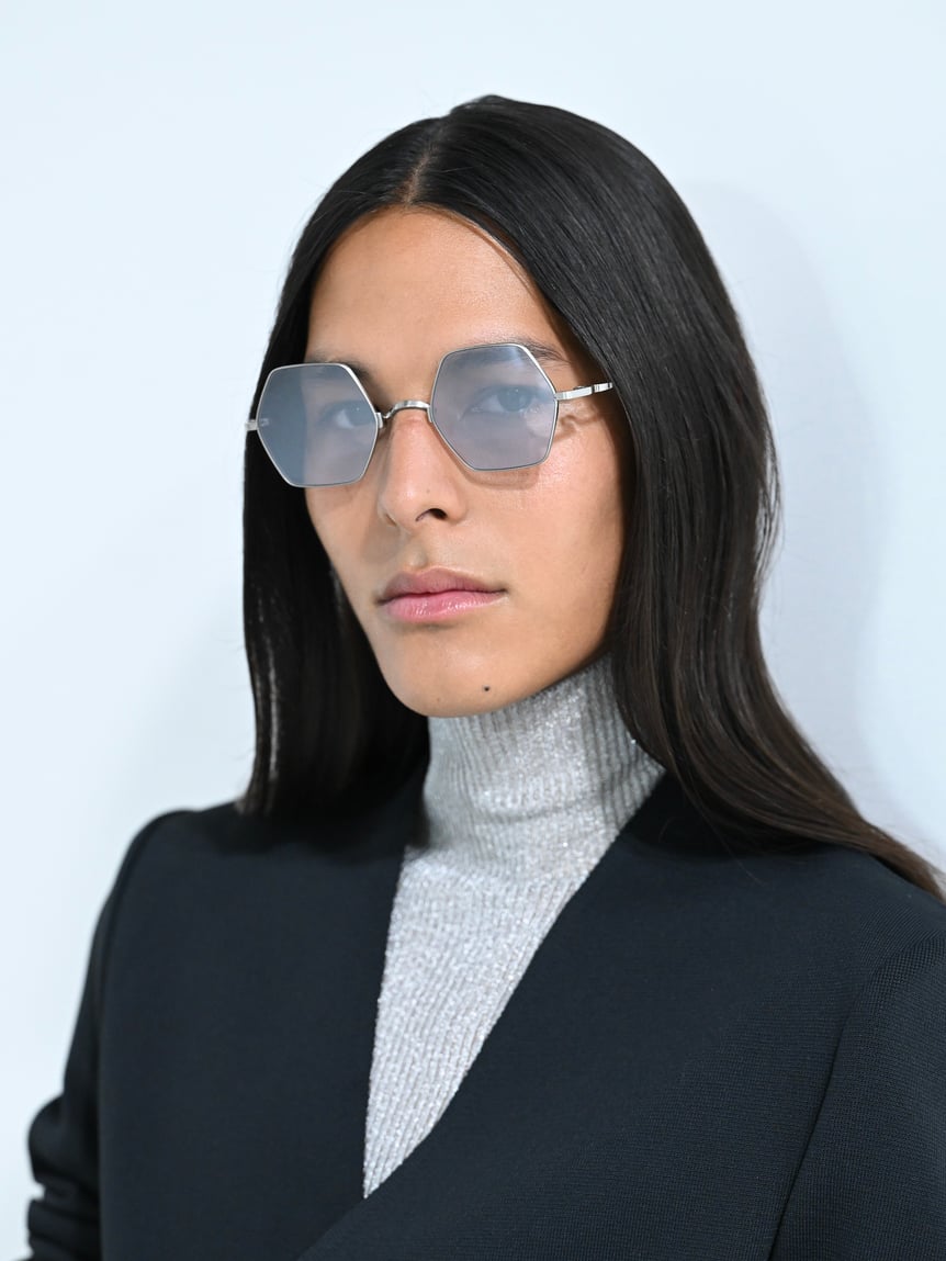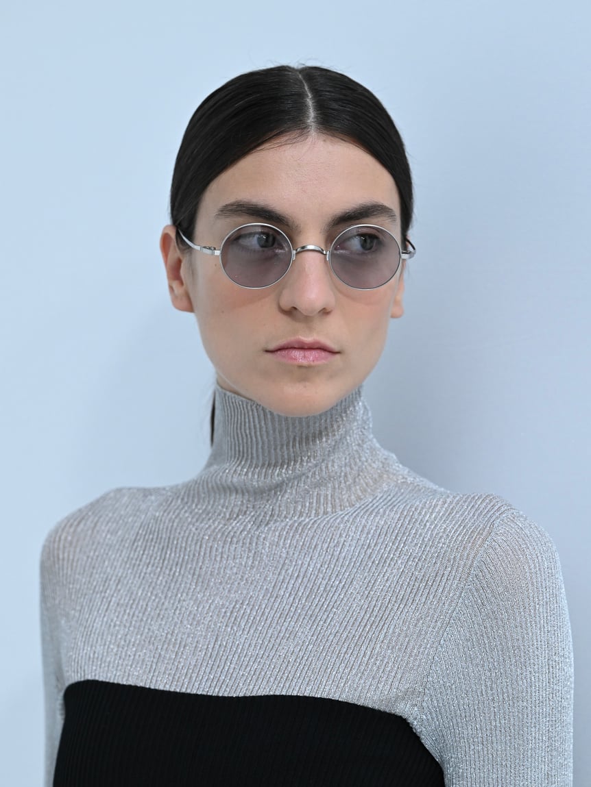 スタイリングに用いられていたサングラスは、すべて999.9(フォーナインズ)とのコラボレーション。しなやかな一本線を描くようなフォルムは、一本の糸から編み出されるCFCLのニットウェアをイメージしているという。2024年春に発売予定となっている。
