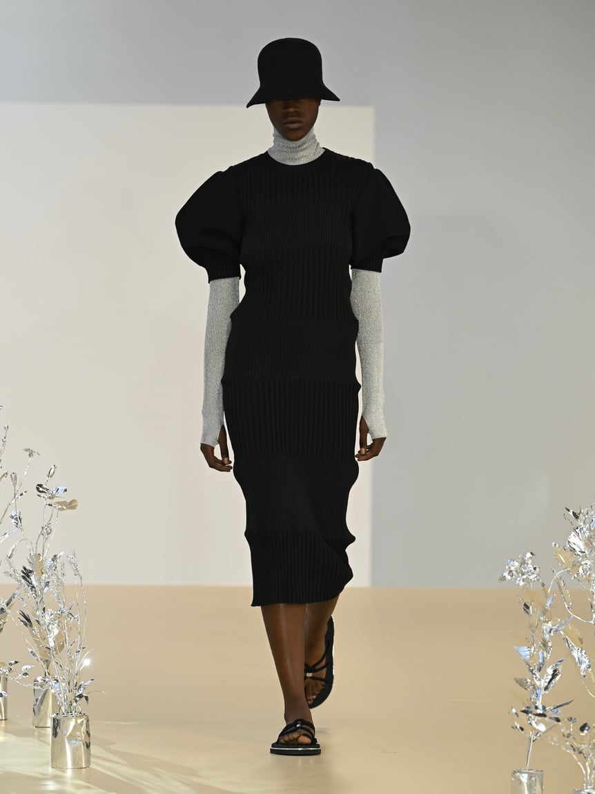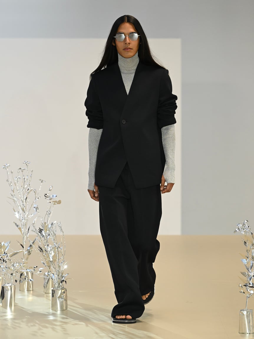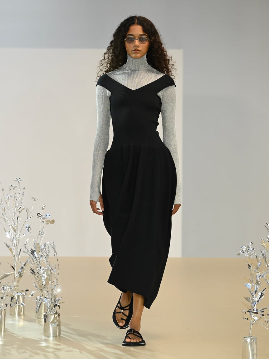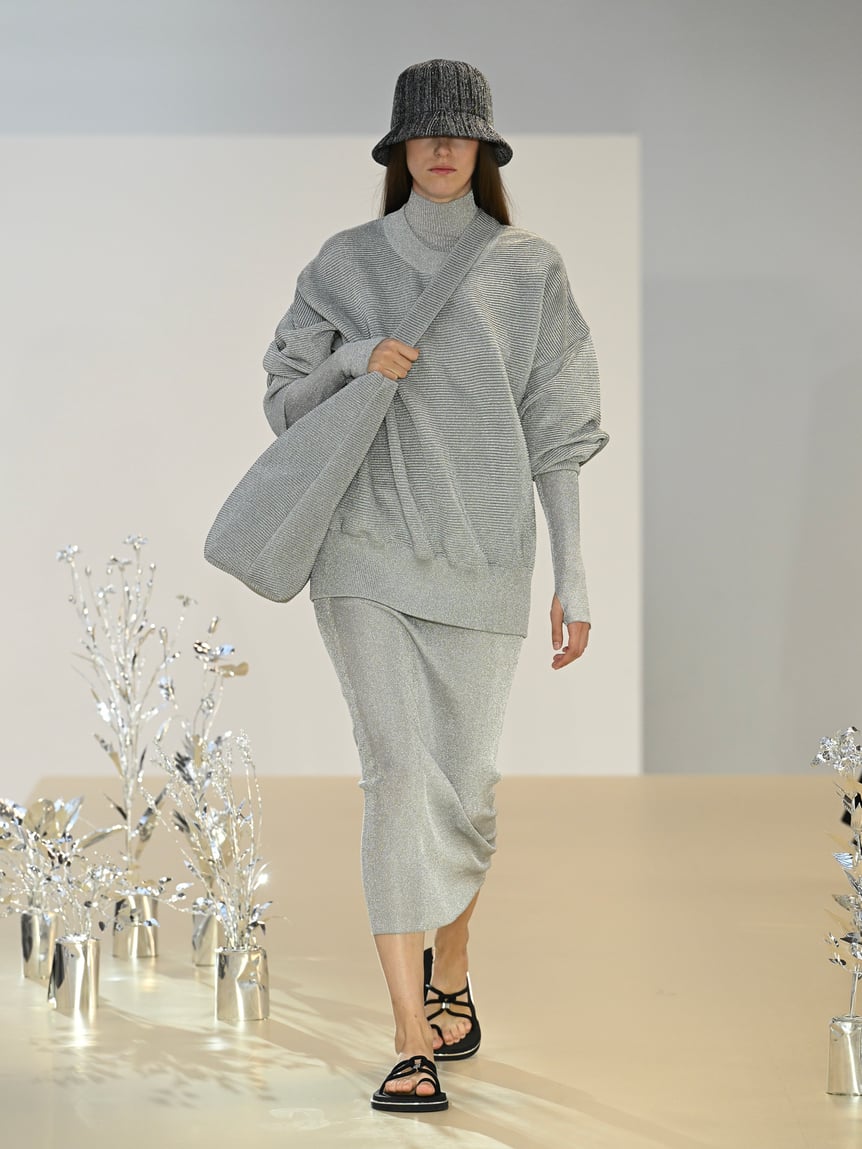 ファーストルックは、シルバーグレーのラメニットをコーディネートしたブラックのセットアップ。シルバーとブラックで構成されたルックが続き、その後、シルバーで統一されたルックへ。コレクションキーワードである、近未来的なムードが高まっていく。