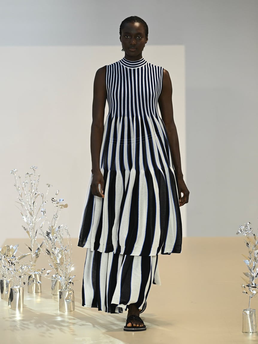 続いては、乾いた大地に流れ落ちる滝をイメージしたというストライプのシリーズ。上から下へ向かってダイナミックに太くなっていく縞模様が印象的だ。歩くたびに風をはらむ、夏らしい軽やかなティアードドレスは、オーガニックコットンと再生ポリエステルをミックスした糸を用いることで、絶妙なボリューム感とドライな質感を生み出している。