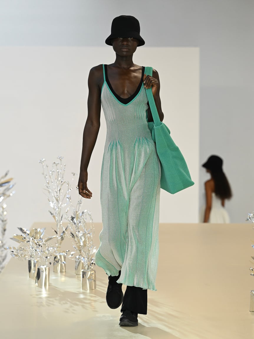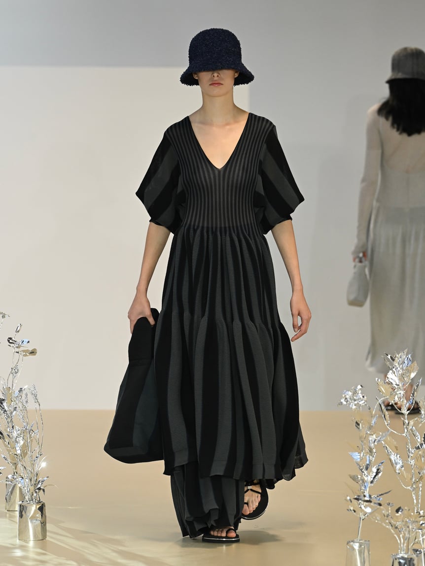 続いて、菌糸のように枝分かれして広がり、見る角度によって異なる印象を与えるストライプのシリーズへ。淡いグリーンやピンクといったカラーリング、光に透けるマテリアルで、自然が持つ複雑な色彩を表現した。また、構築的なフィット&フレアのシルエットをシームレスで表現するなど、ブランドならではのテクニックも垣間見られる。