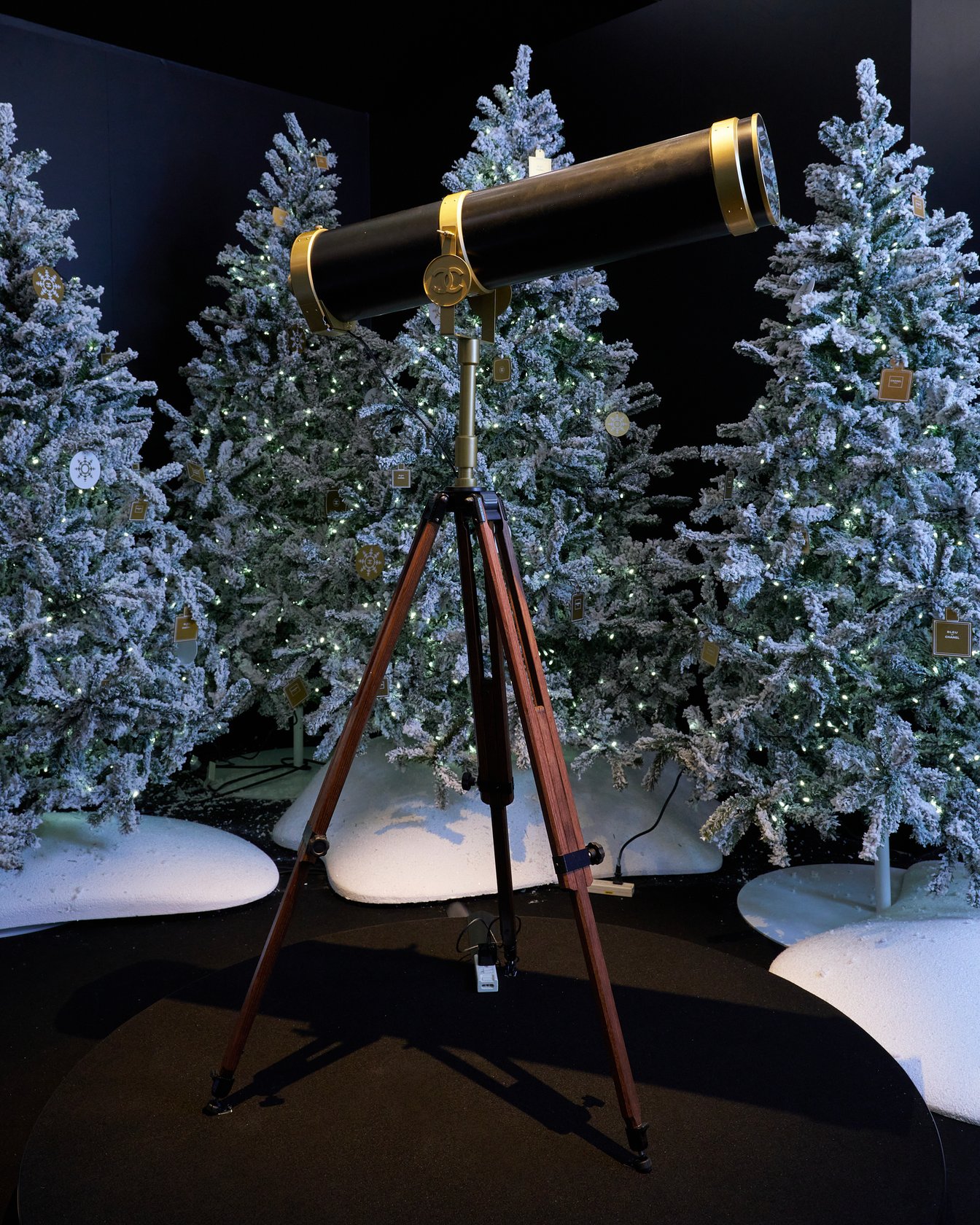 エントランスでナビゲーターから、シャネル ウィンターテイルのストーリーとこれから始まるアクティビティについて説明を受けてライトとブックレットを受け取ります。先に進むと、フレグランス「シャネル N°5」と「チャンス」、「ガブリエル シャネル」の幻想的な世界でわくわくする宝探しがスタート。ライトを使ってオーナメントの中に隠されたキーワードを探してアクティビティを完成させます。ちょっと疲れたらそこに置かれた望遠鏡を覗いてみて。また違った別世界を楽しんで。