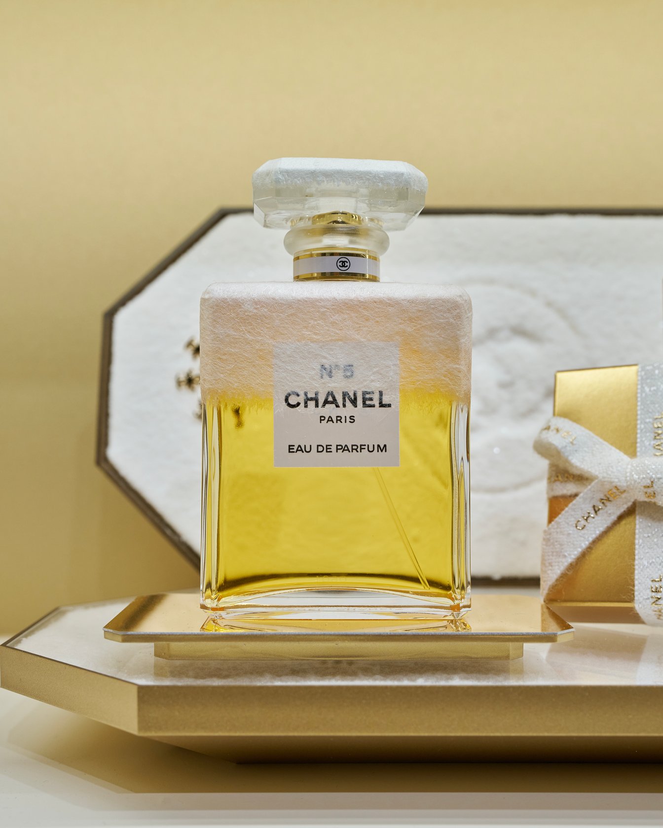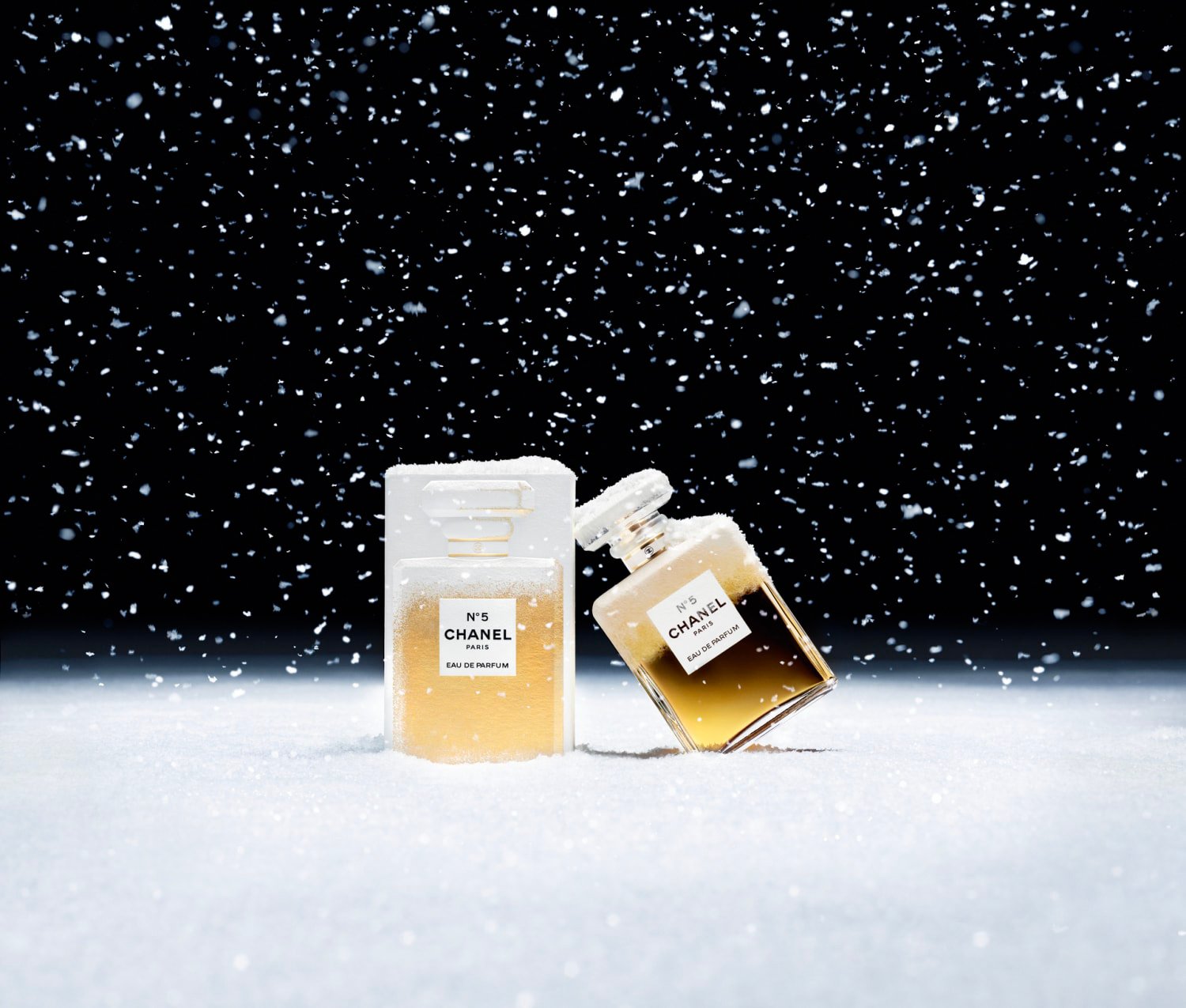繊細に降り積もる雪に包まれたスペシャルなシャネル N°5。宝石のようにきらめくボトルが、手作業であしらわれたシルクのヴェールをまといます。